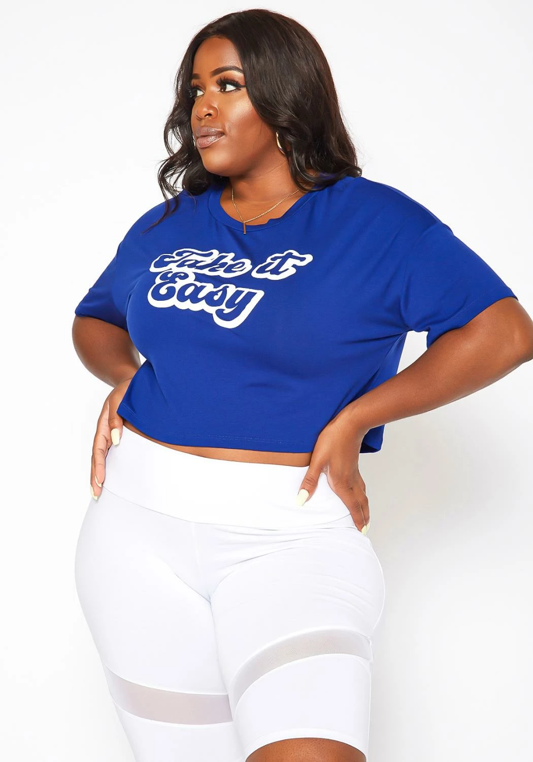 Plus size women’s ‘Take it Easy’ statement crop top in crew neck style, short sleeves and relaxed fitting.