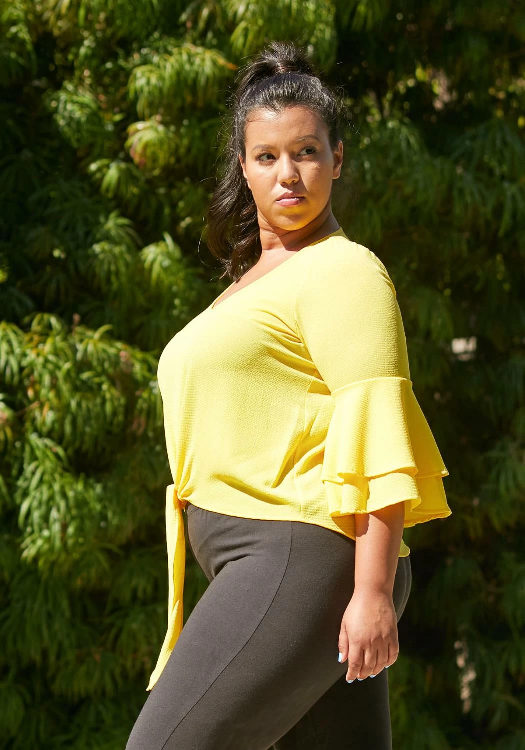 Plus size tie hem ruffle sleeve blouse.
