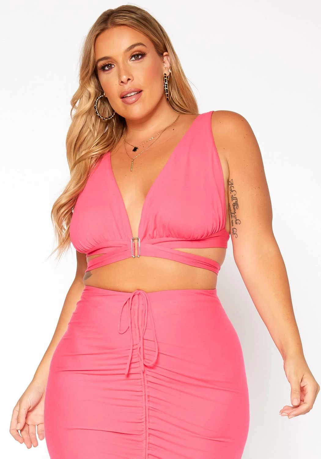 Summer favorite plus size women’s crop top in v-neck style, wrap design, clip front fastening and cami shoulder straps.