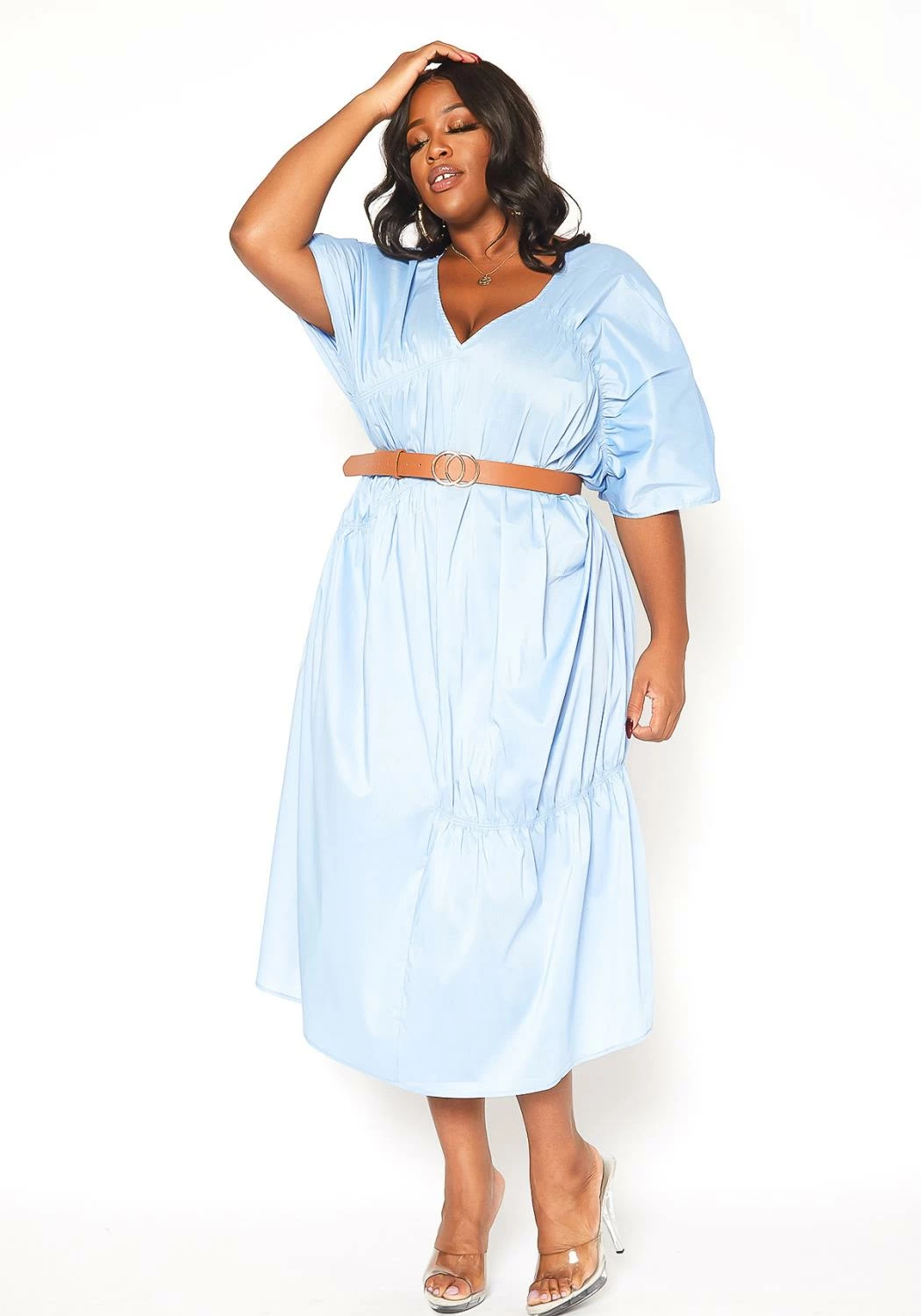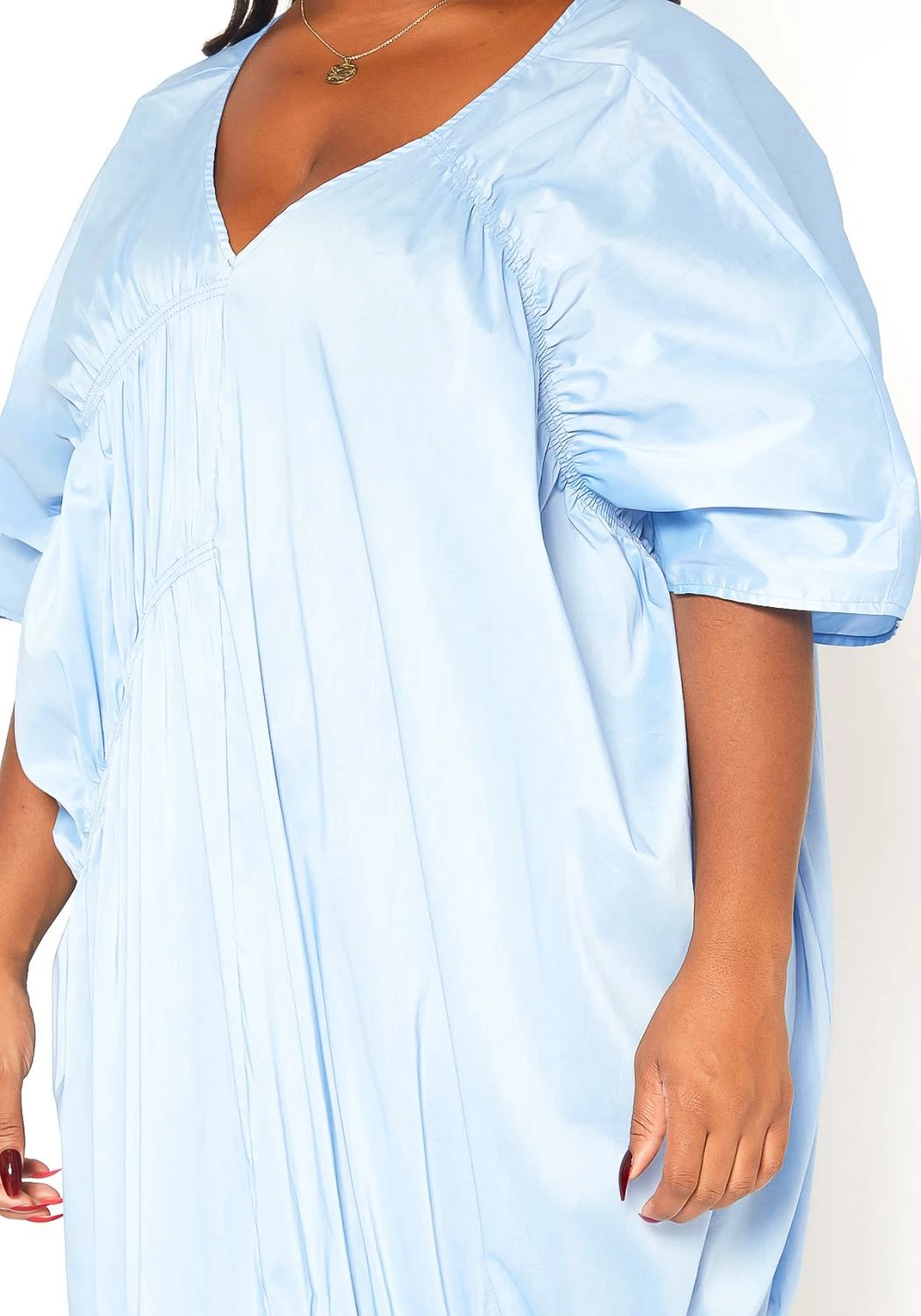 Plus size women’s V-Neck oversized loosely fitted midi dress with ruched detailing and batwing short sleeves.