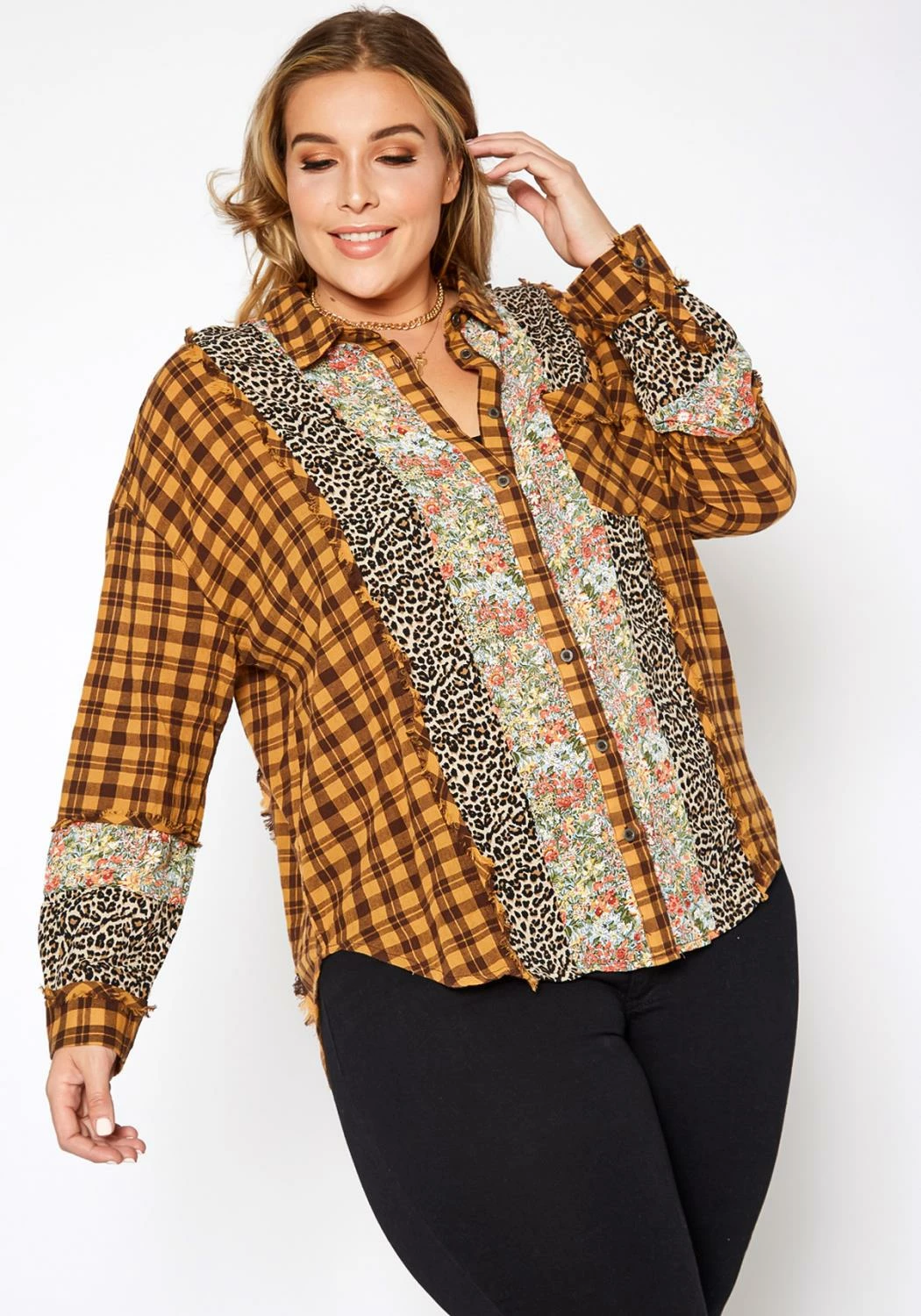 All the vintage prints in one! Features tartan plaid, leopard print, tiny floral print, full front button closure, collar neck and long sleeves with buttoned wrist cuffs.