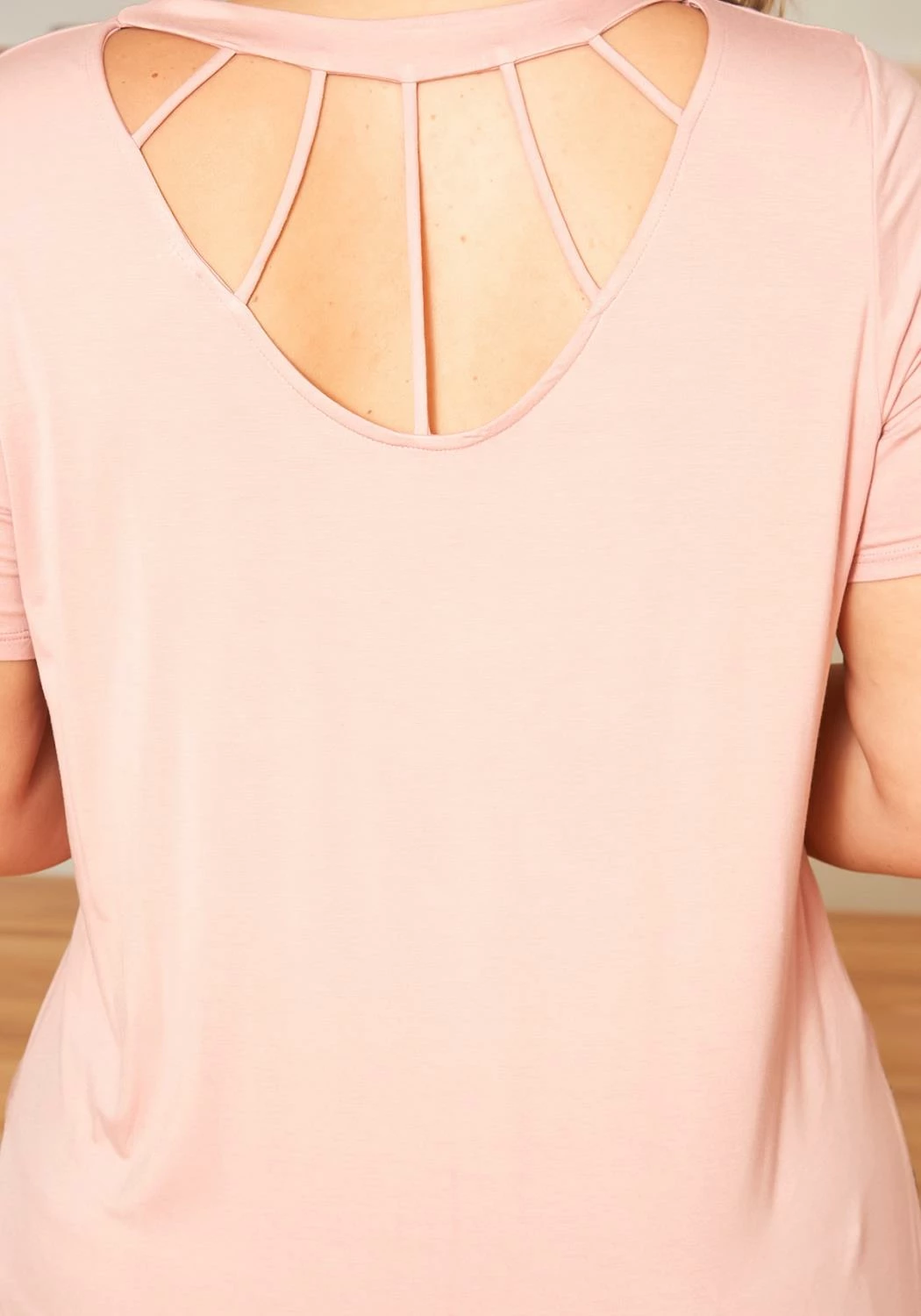 Plus size women’s essential basic t-shirt with unique windowpane back cut-out design, short sleeve, crew neck style and side slit hem.