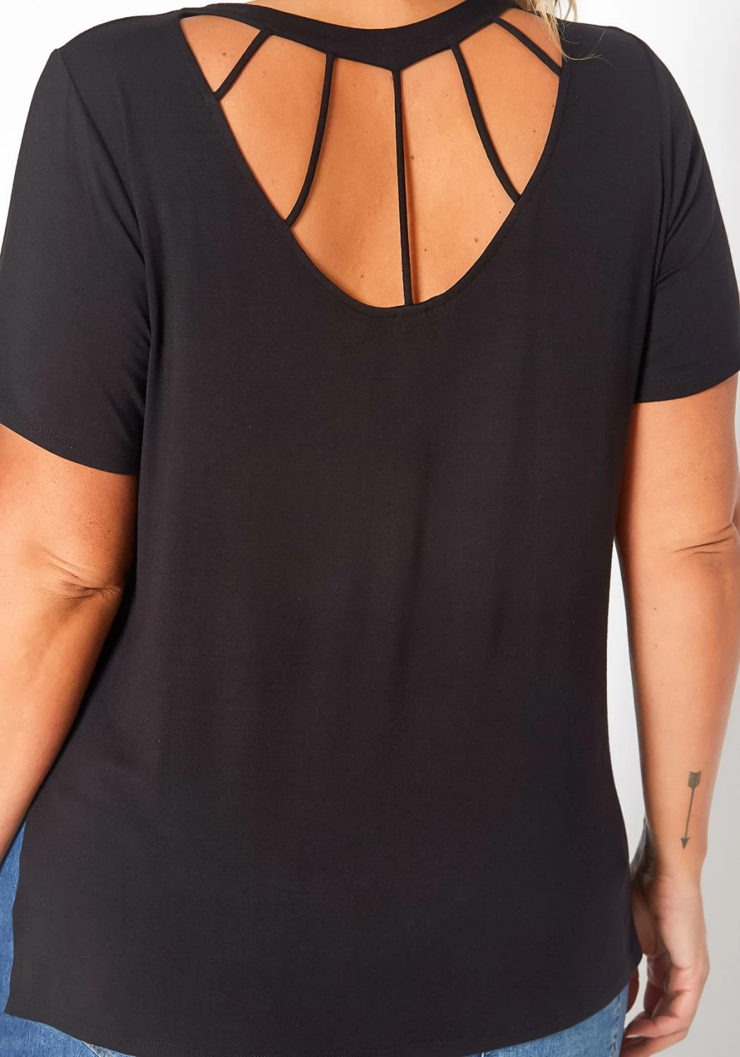 Plus size women’s essential basic t-shirt with unique windowpane back cut-out design, short sleeve, crew neck style and side slit hem.
