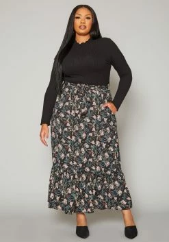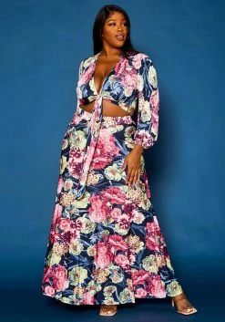 Plus Size Floral Pattern Flare Maxi Skirt