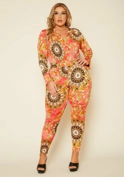 Plus Size Damask Print Overlap Bodysuit & Leggings Set