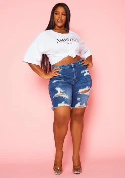 Plus Size Distressed Mid Length Denim Shorts