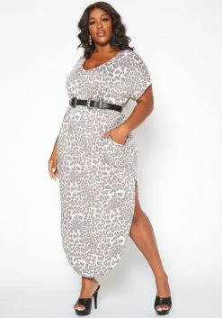 Asoph Plus Size Ashy Leopard Print Curved Hem Maxi Dress