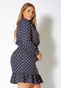 Pleione Plus Size Polka Dot Tie Neck Dress