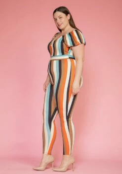 Plus Size Puff Sleeve Multi Stripe Jumpsuit