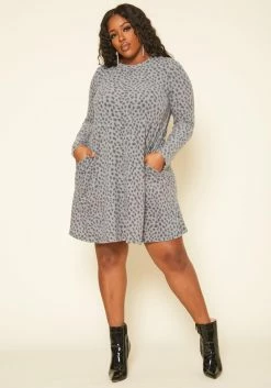 Plus Size Spotted Long Sleeve Flare Mini Dress