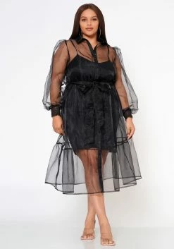 Plus Size Top Trend Sheer Button Front Fit & Flare Dress