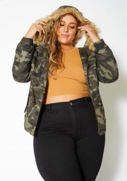 Asoph Plus Size Womens Faux Fur Trim Camo Puffer Jacket