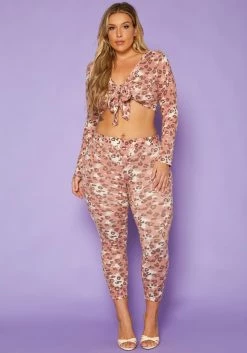 [Special Price] Plus Size Leopard Print Tie Front Crop Top & Leggings Set