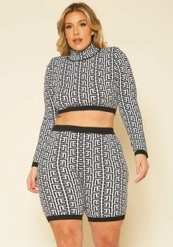 Plus Size Greek Key Print Crop Top & Biker Shorts Set