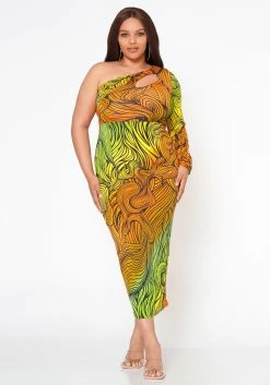 Plus Size Multi Abstract Pattern One Sleeve Midi Dress