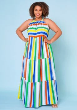 Plus Size Multi Stripe Halter Neck Flare Maxi Dress