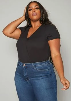 Plus Size Ribbed V Neck Short Sleeve Bodysuit