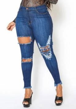 Vibrant Plus Size Front & Back Distress Hem Jean
