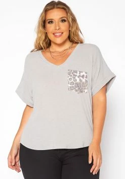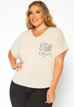 Asoph Plus Size Leopard Pocket Hem V Neck Shirt
