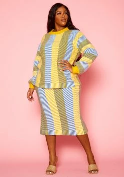 Pleione Plus Size Multi Stripe Midi Knit Skirt
