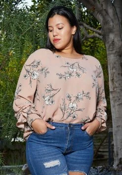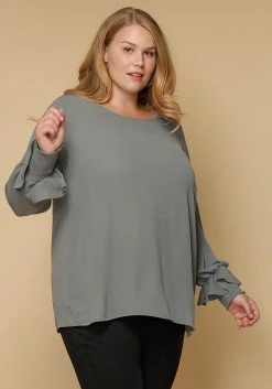 Pleione Round Neck Plus Size Women Clothing Smocked Ruffle Cuff Top