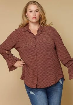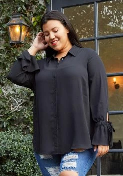 Pleione Self-tie Bell Cuff Plus Size Women Clothing Button Down Shirt Blouse