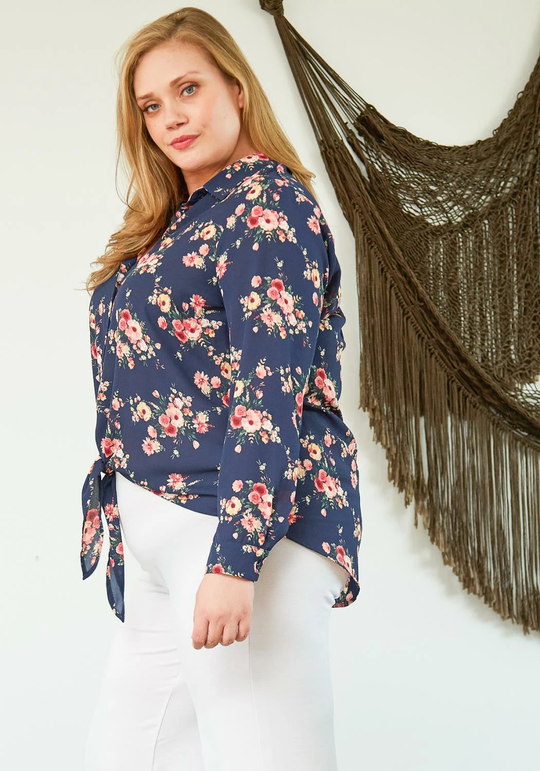 A button up blouse with a lush floral print and a tie knot hem. Wear with dress pants for work or wear it with jeans for a casual day.