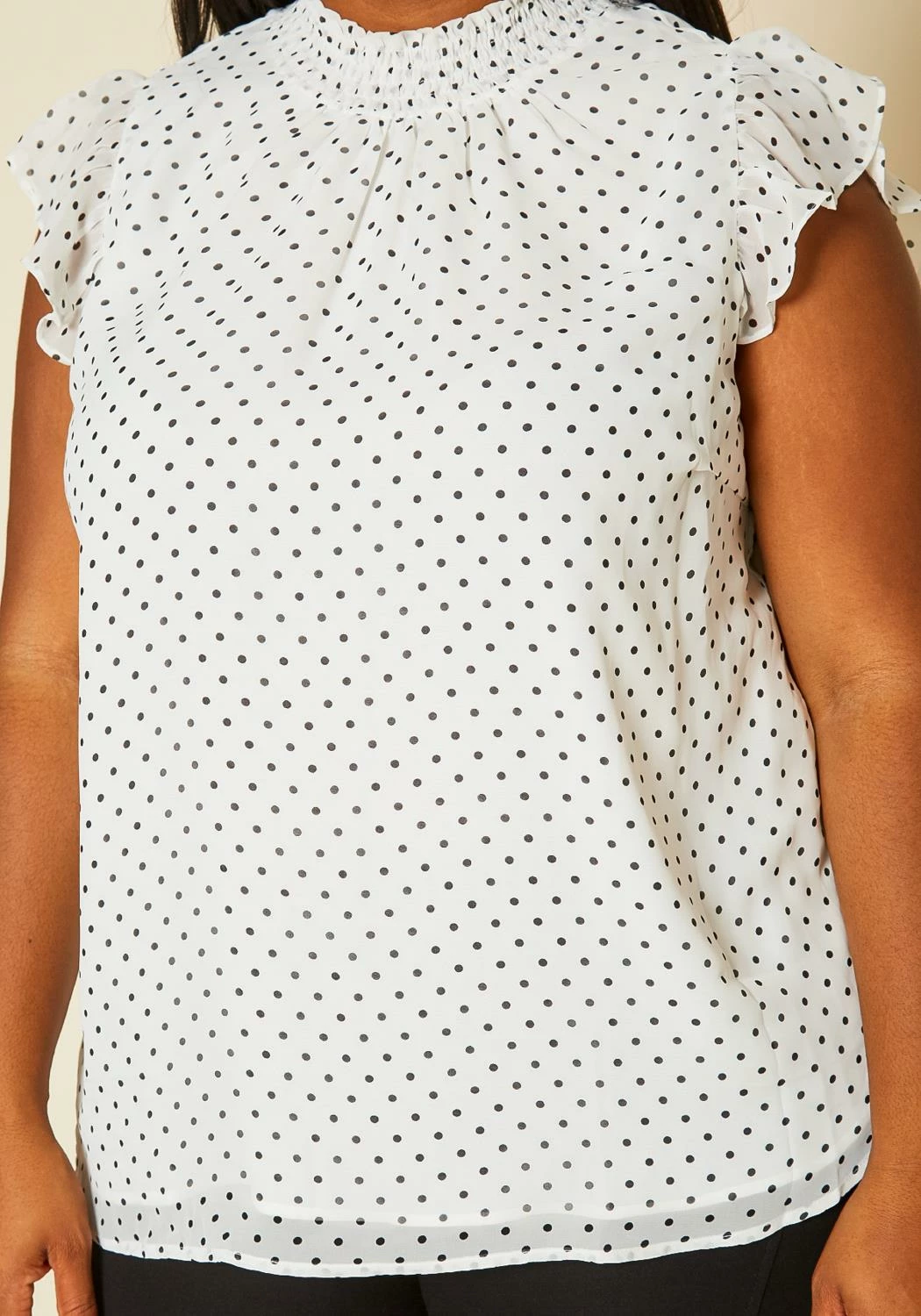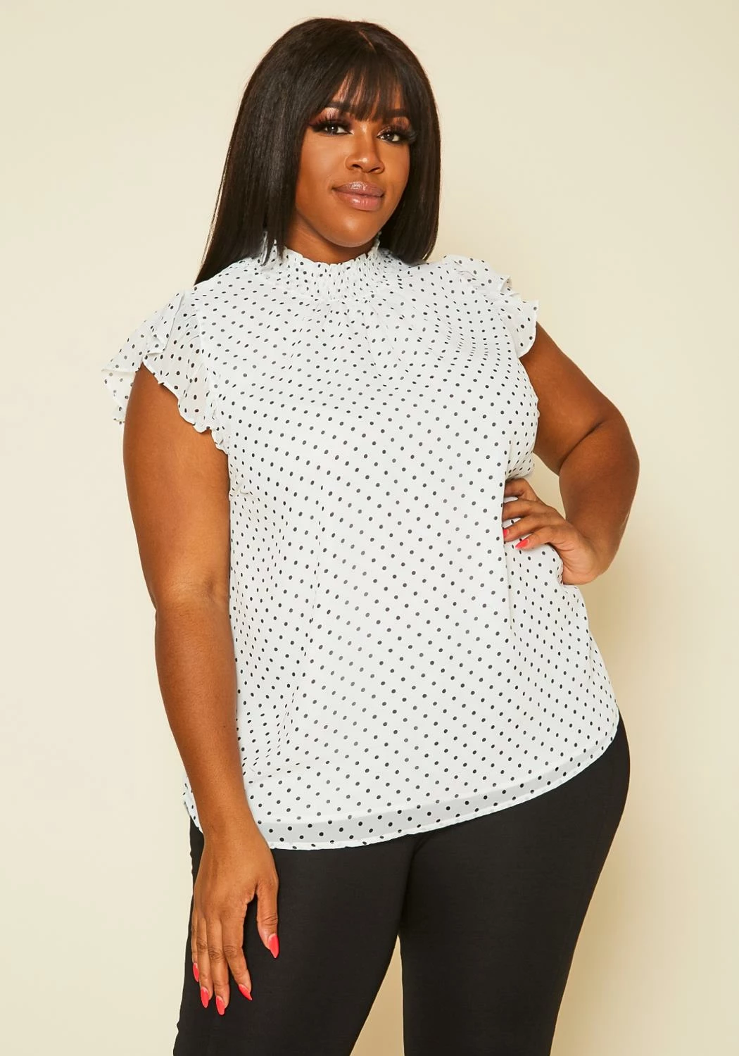 Plus size women’s top featuring mock neck hem, ruffle short sleeves & back button closure.