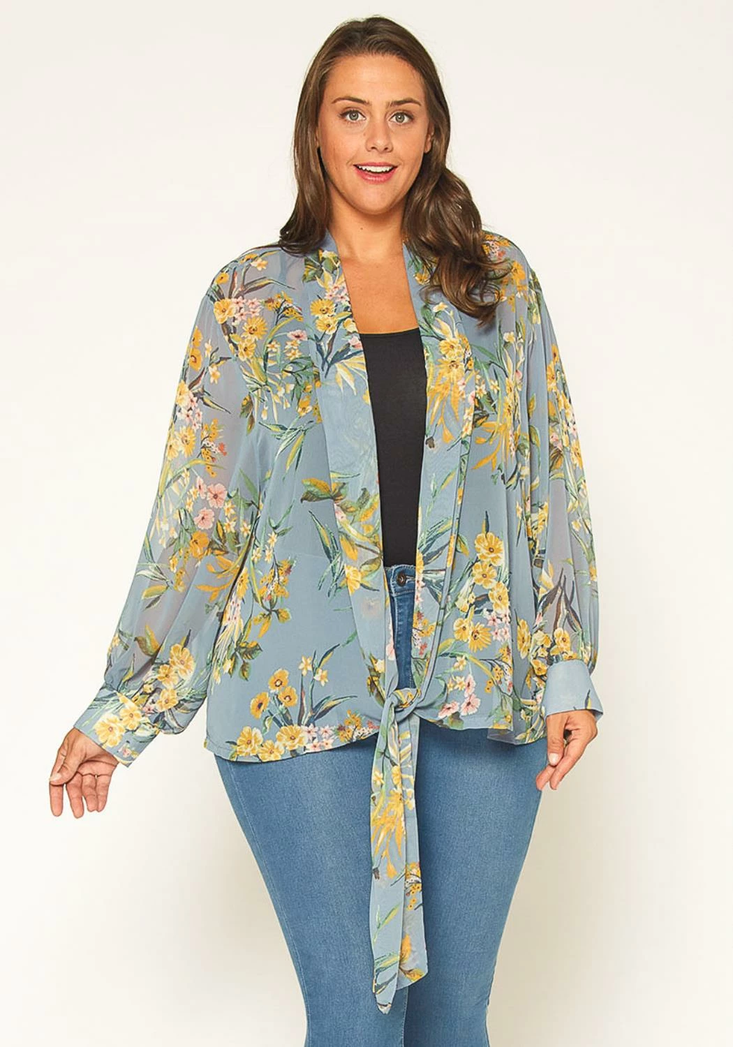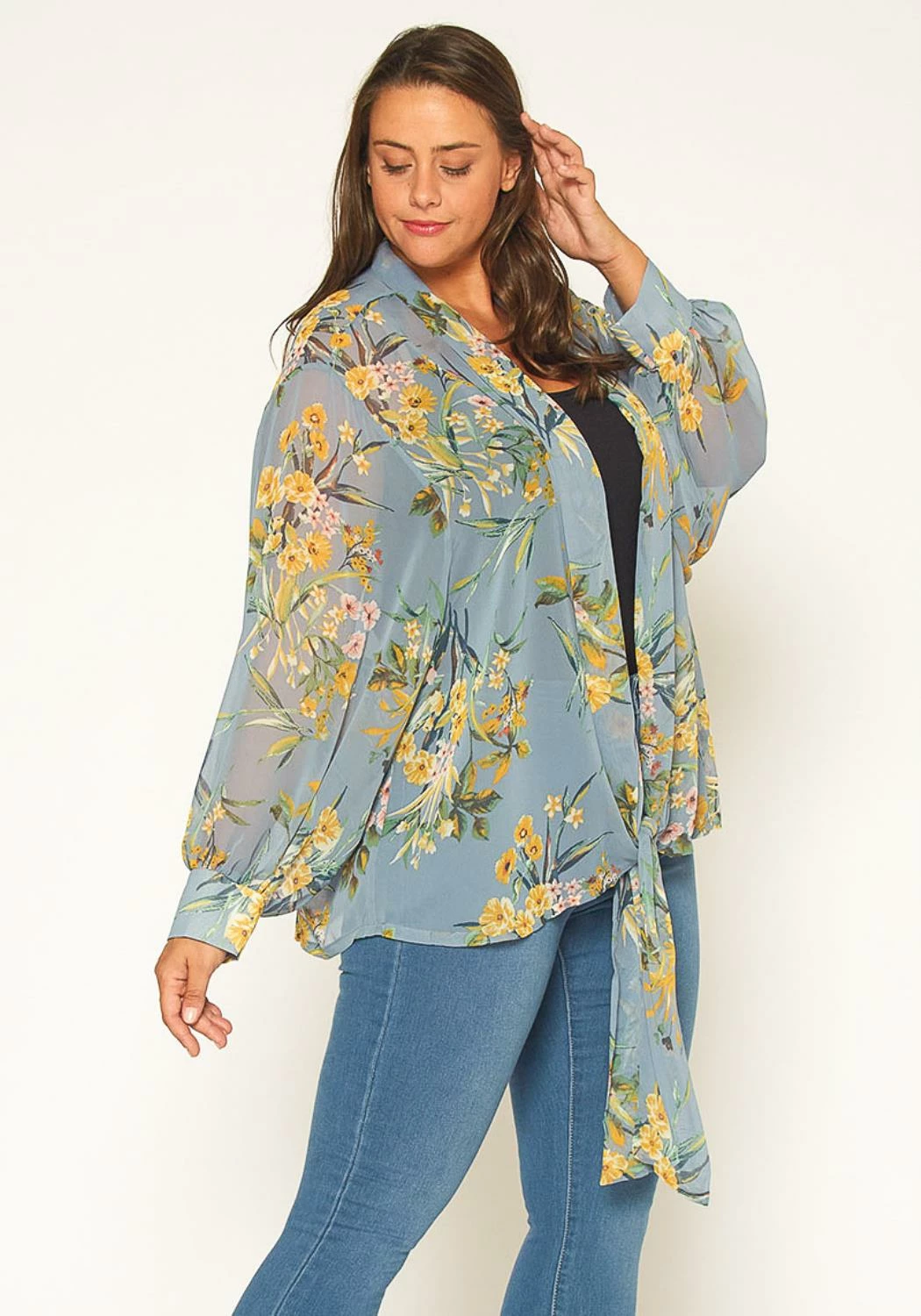 Women’s semi sheer flower printed long sleeve flowy blouse top with tie hem closure.