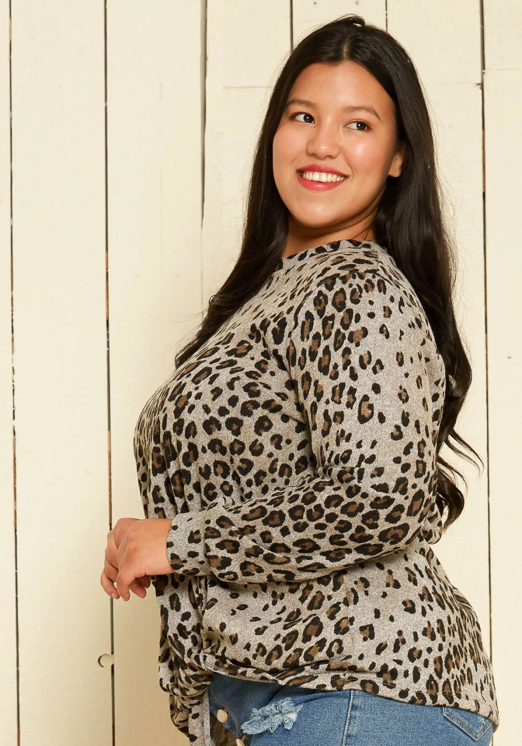 A casual plus size sweater with leopard print and a wrap knot tie hem.