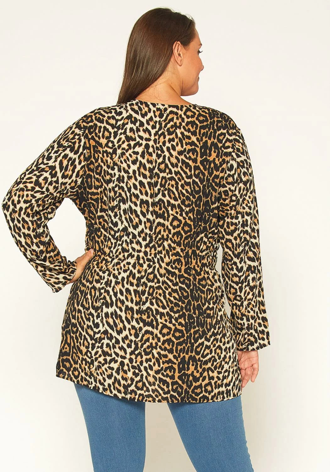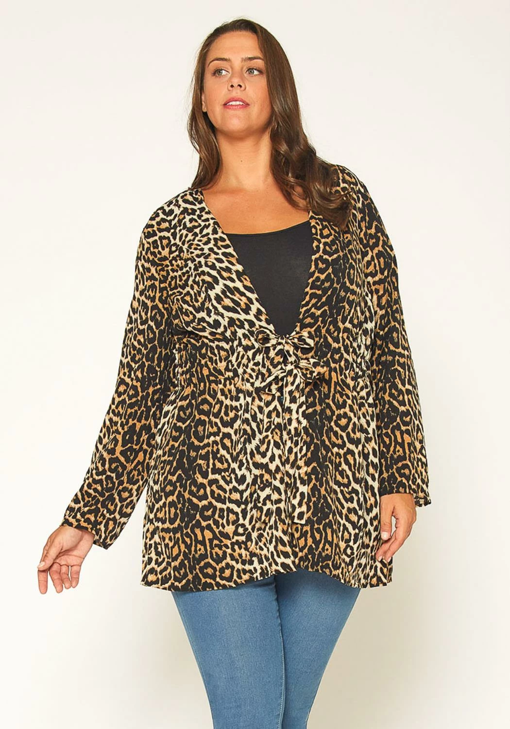 Plus size women’s fierce leopard printed long sleeve top with tie front closure.