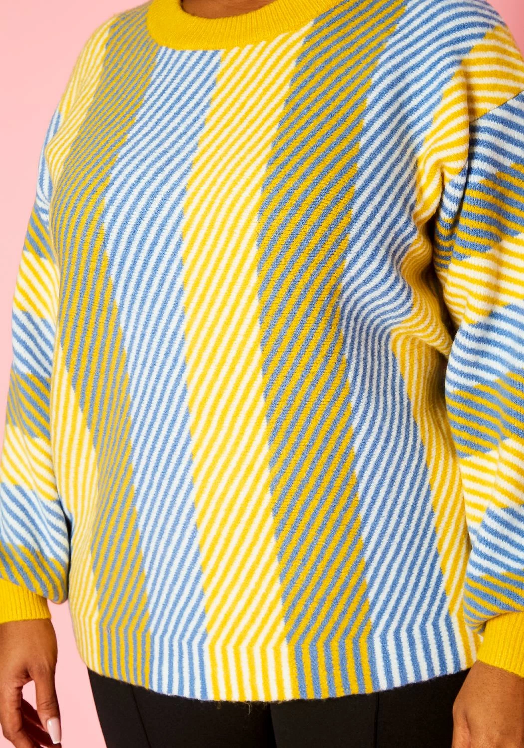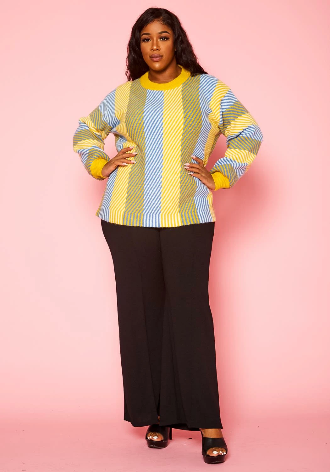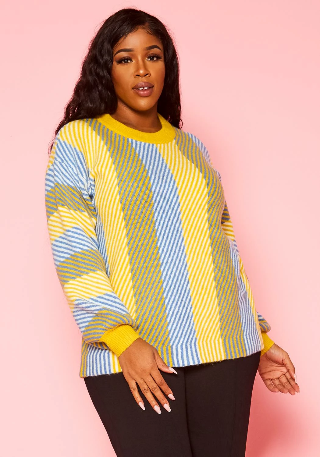 Plus size women’s crewneck thick sweater with multi color bright stripe prints.