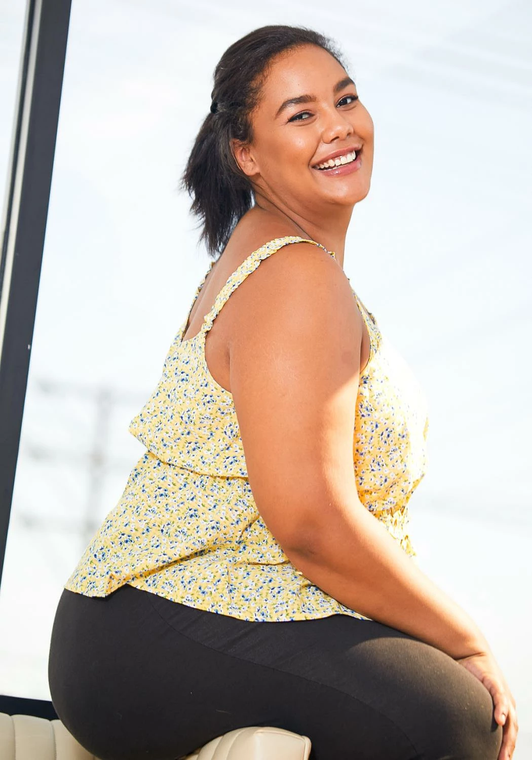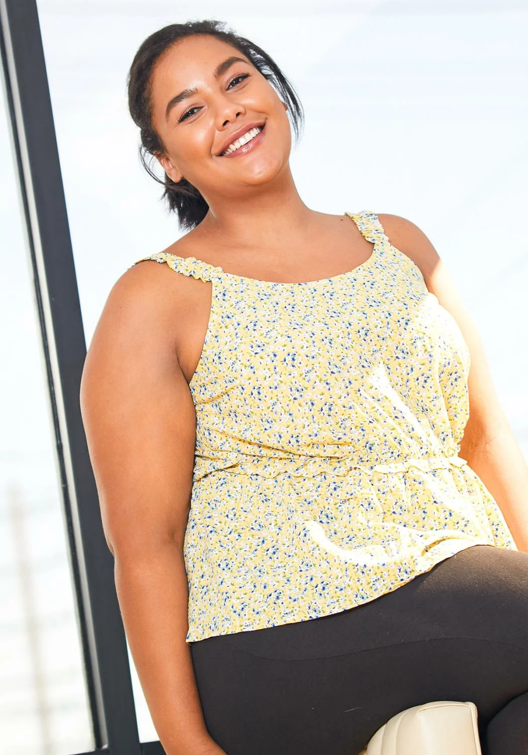 Pleione’s sweet floral women blouse with ruffled trim detail across the waist and shoulder straps. Great daily top that can easily be styled up with your favorite accessories!