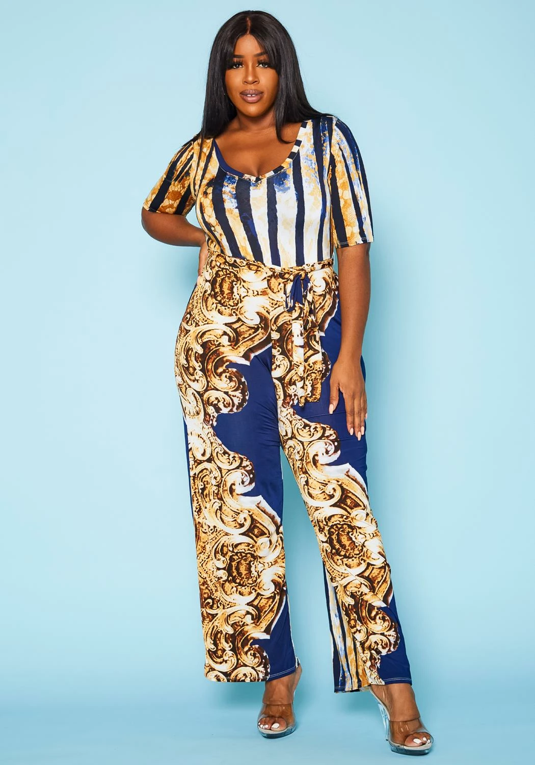 Plus size women’s jumpsuit, featuring v-neck hem, straight leg, short sleeves & a waist detachable tie up belt.