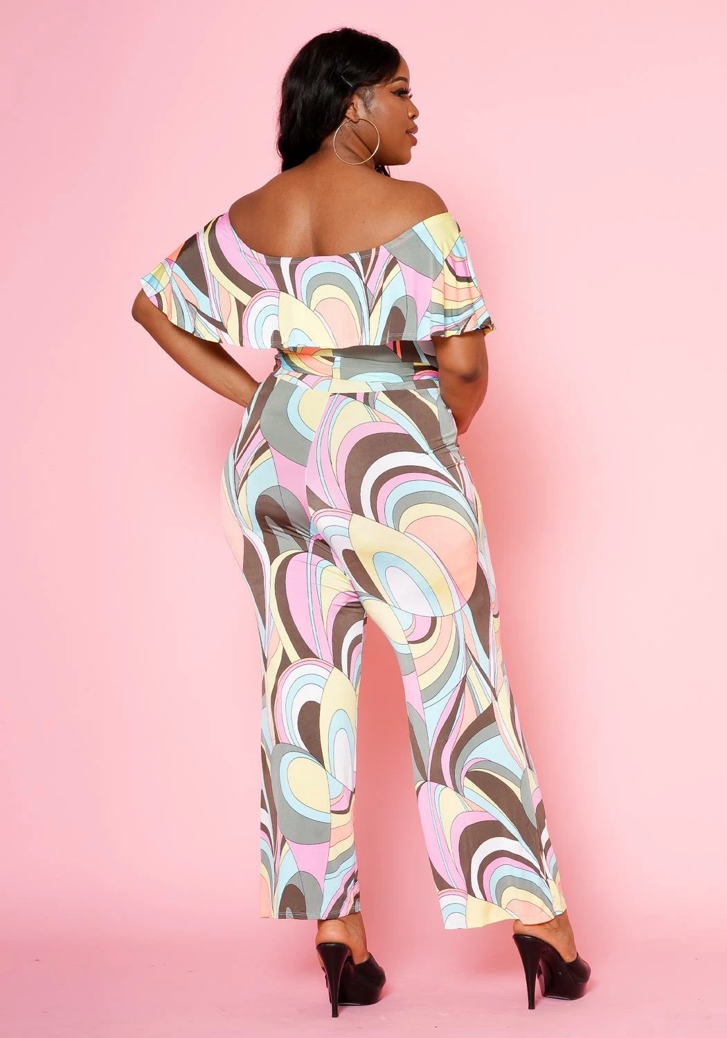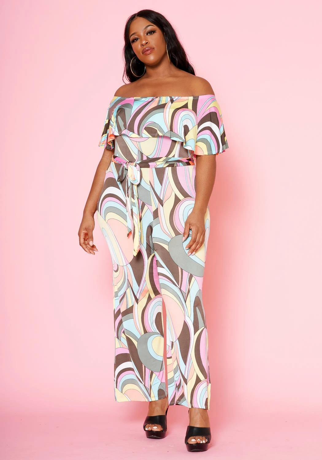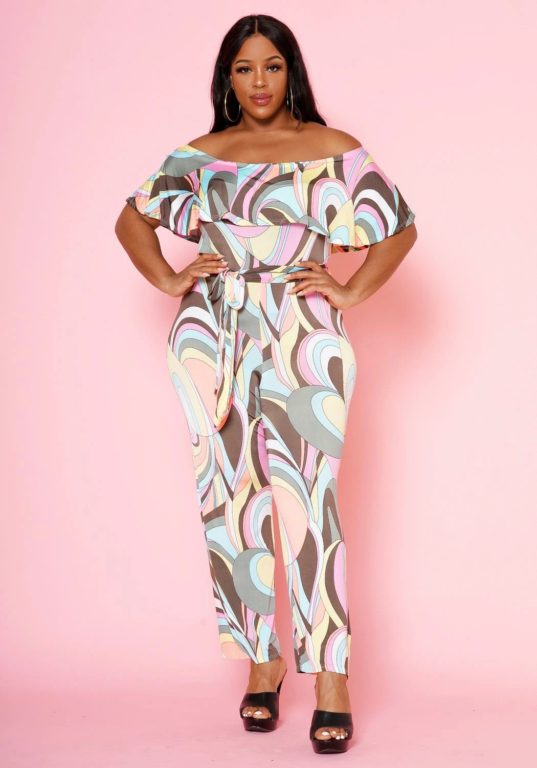 Unique plus size women’s jumpsuit that makes a stylish impression. Features pastel abstract pattern, off shoulder style with overlay hem and waist tie ascent.