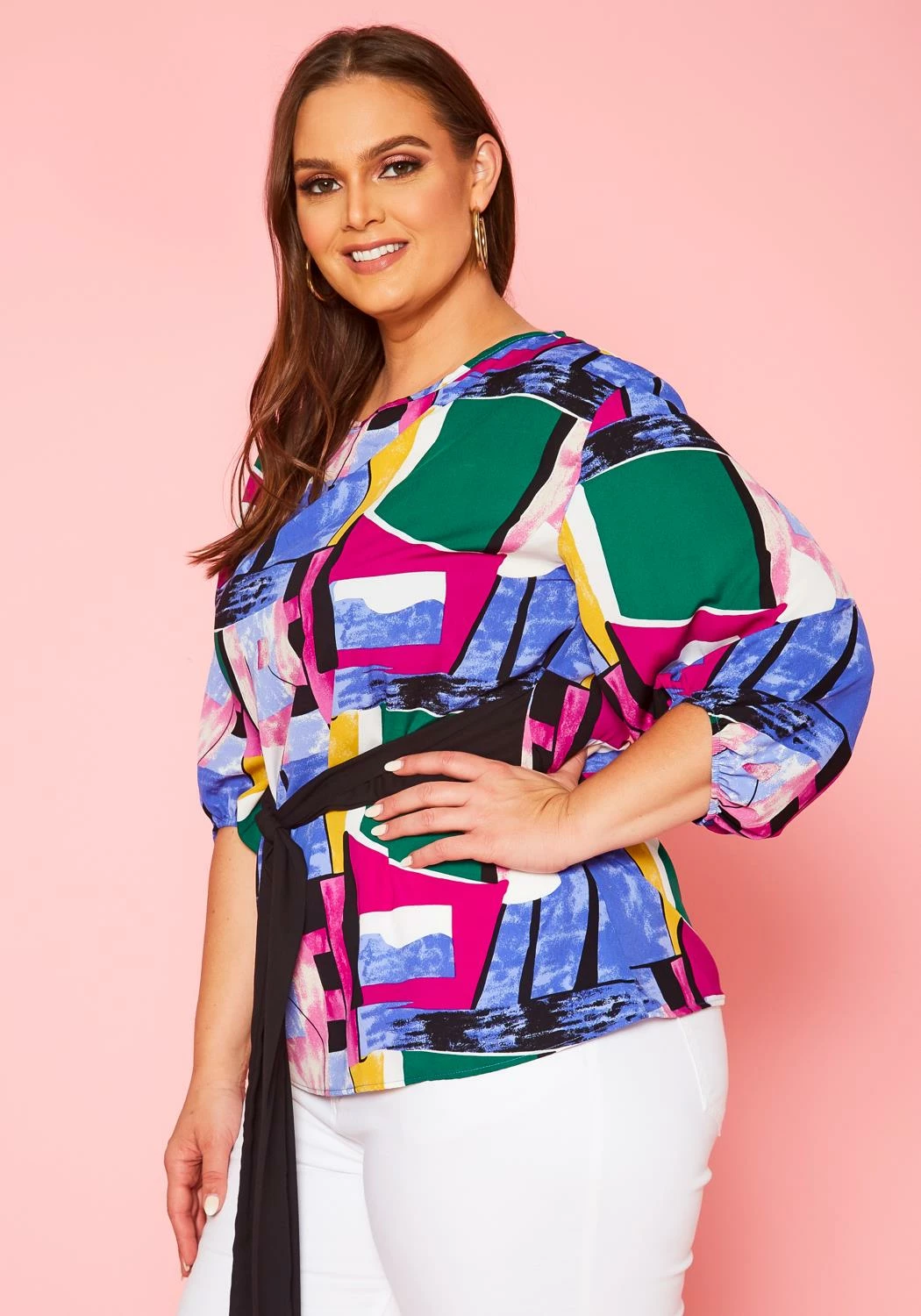 This blouse is absolutely stunning! The abstract pattern is unique and eye-catching. The waist tie adds a flattering touch. Perfect for curvy figures!