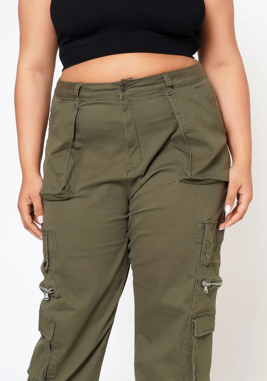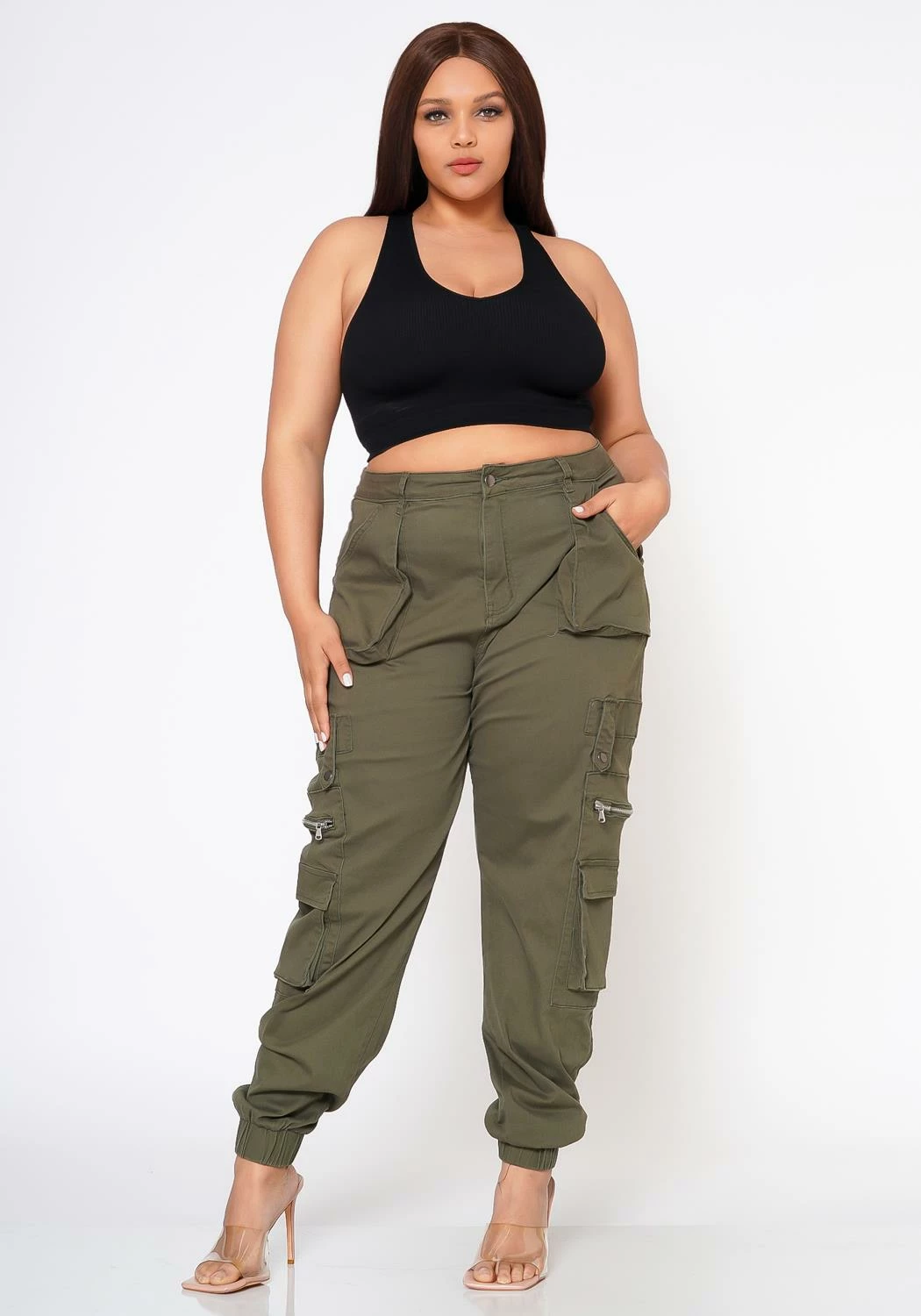 Trendy plus size women’s utility cargo pants featuring pocket hem, ankle cuffs, belt loop holes and mid rise fit.