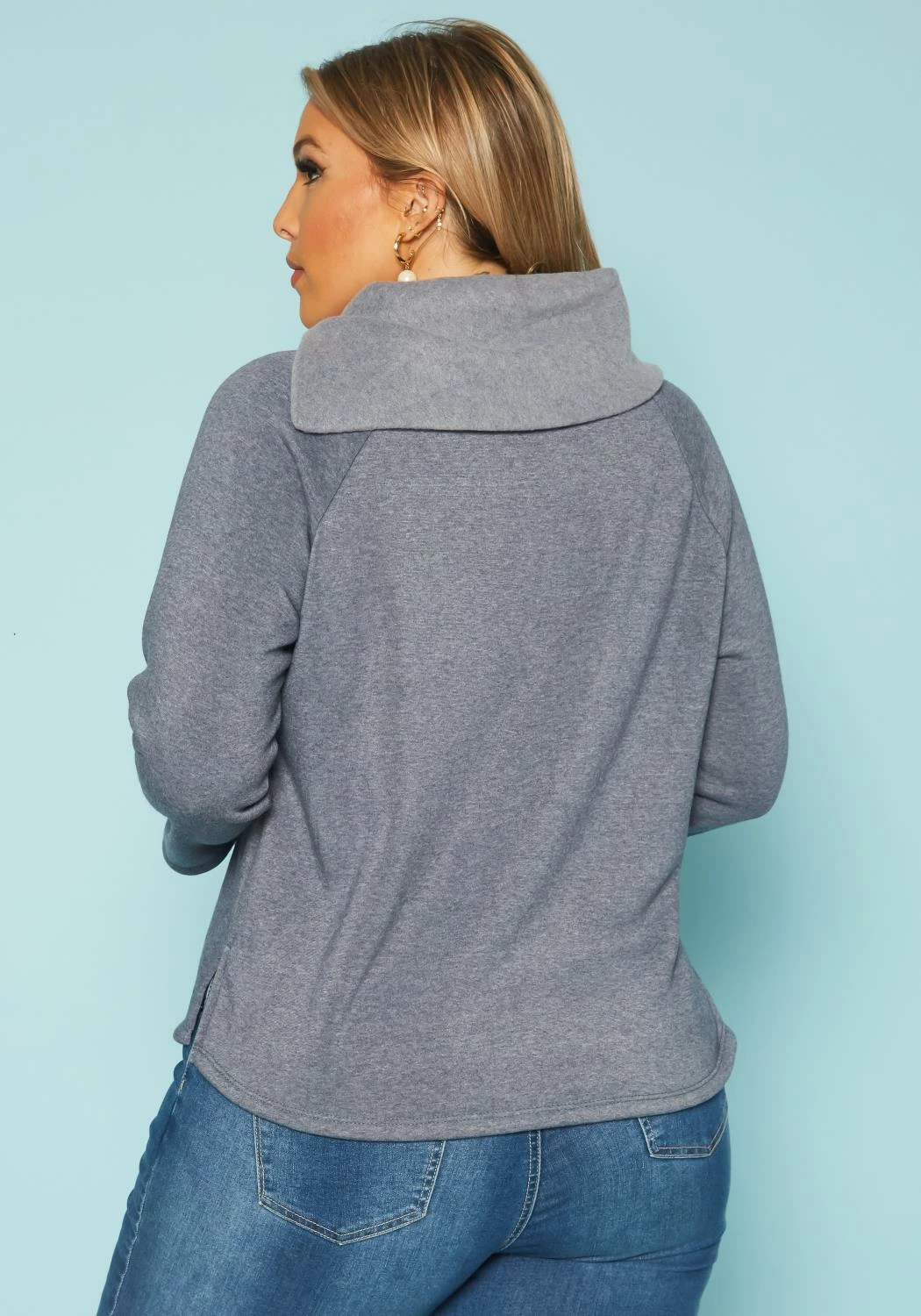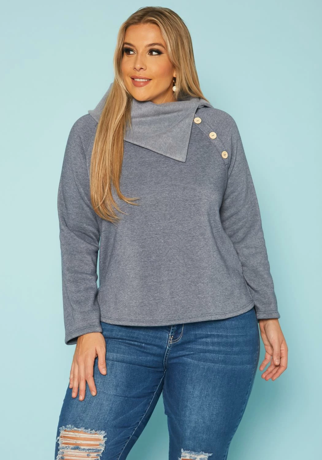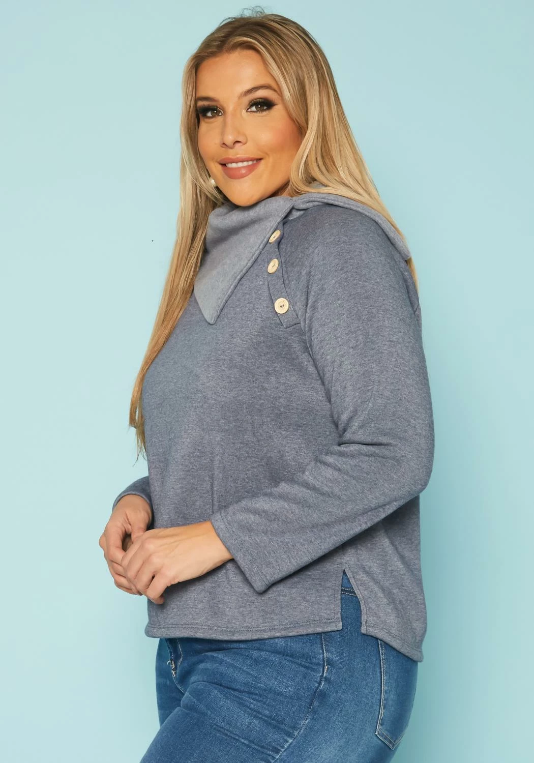 Plus size women’s casual sweater with asymmetric collar neck, long sleeves and button front hem.
