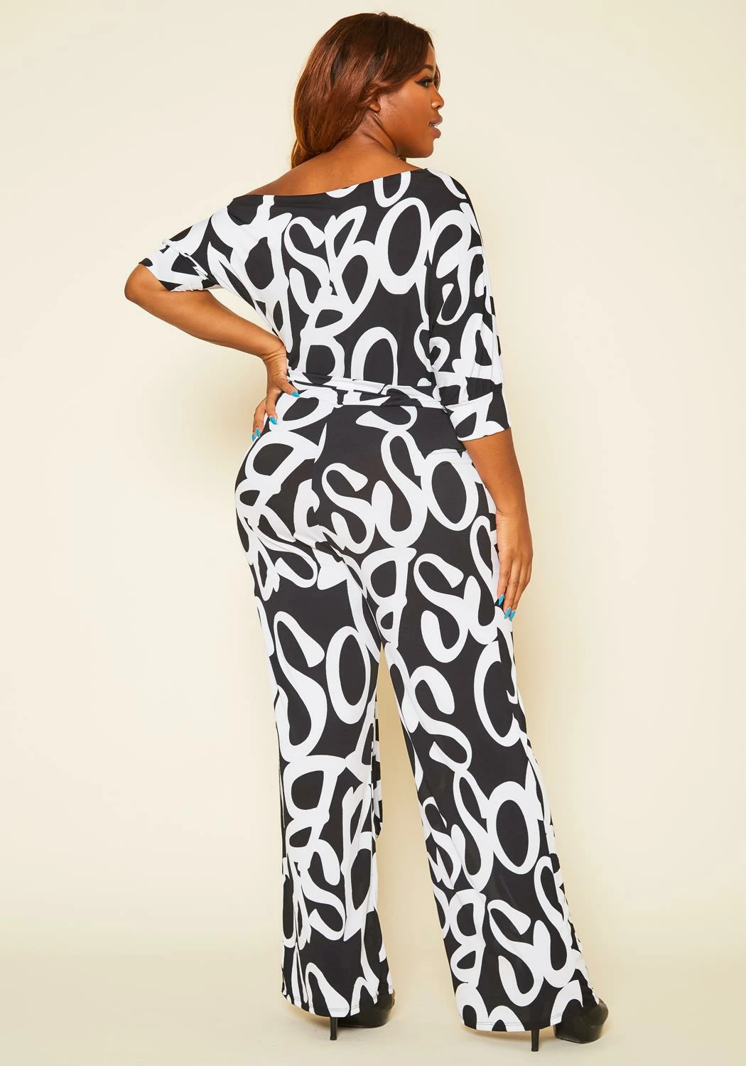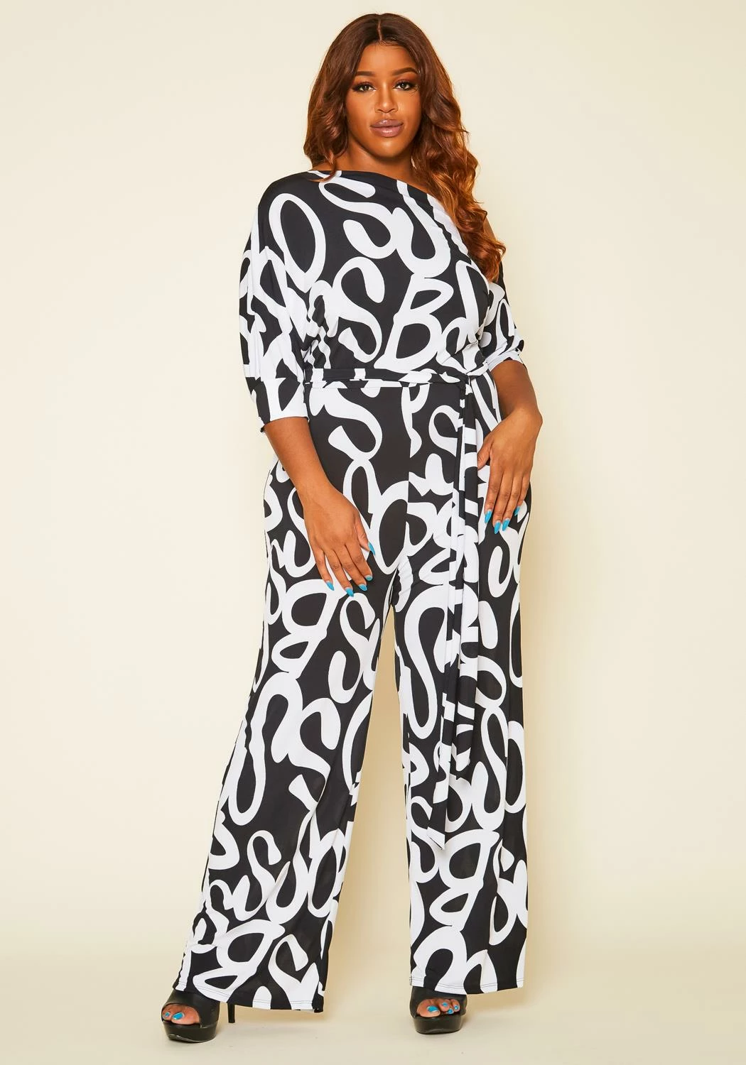 Plus size women’s jumpsuit featuring a asymmetric shoulder hem, multicolor print, elbow sleeves, detachable waist tie and wide flare bottoms.