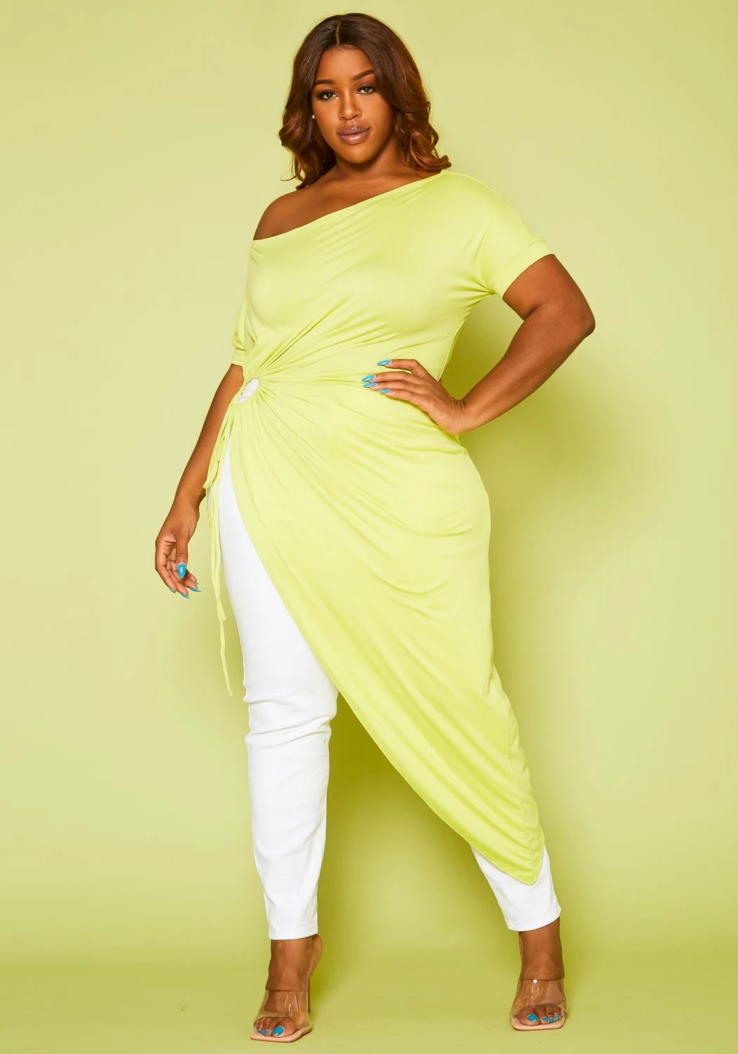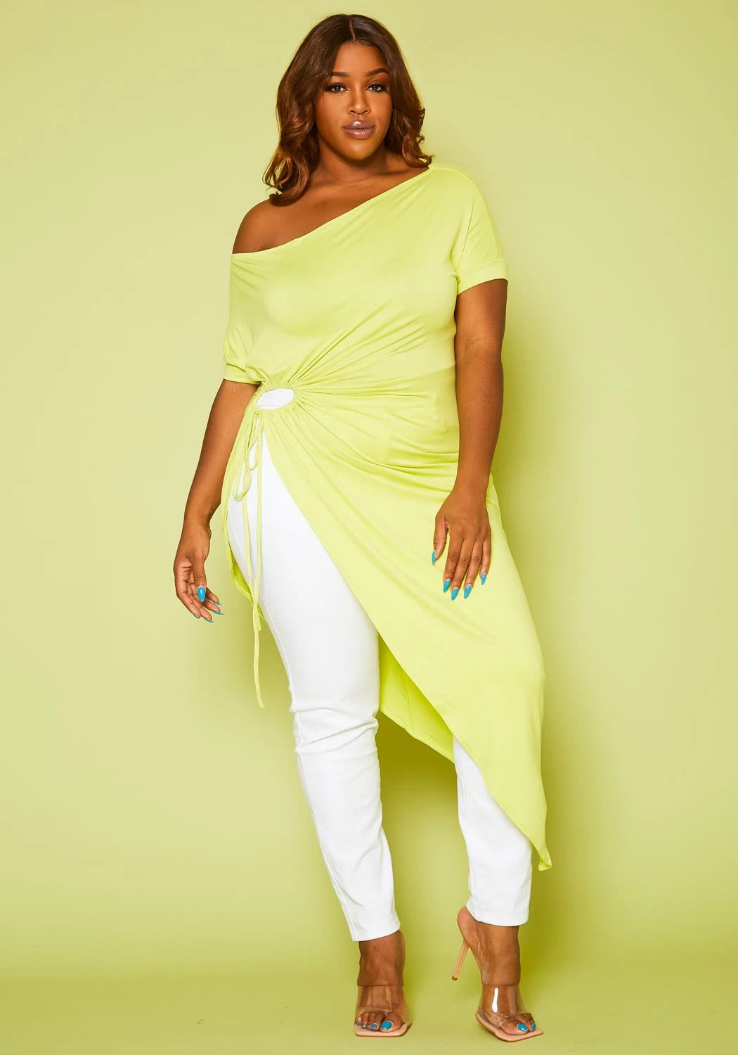 Plus size women’s top in asymmetrical style, featuring a off shoulder neck hem, shorts sleeves with a front o-ring drawstring tie up detail.