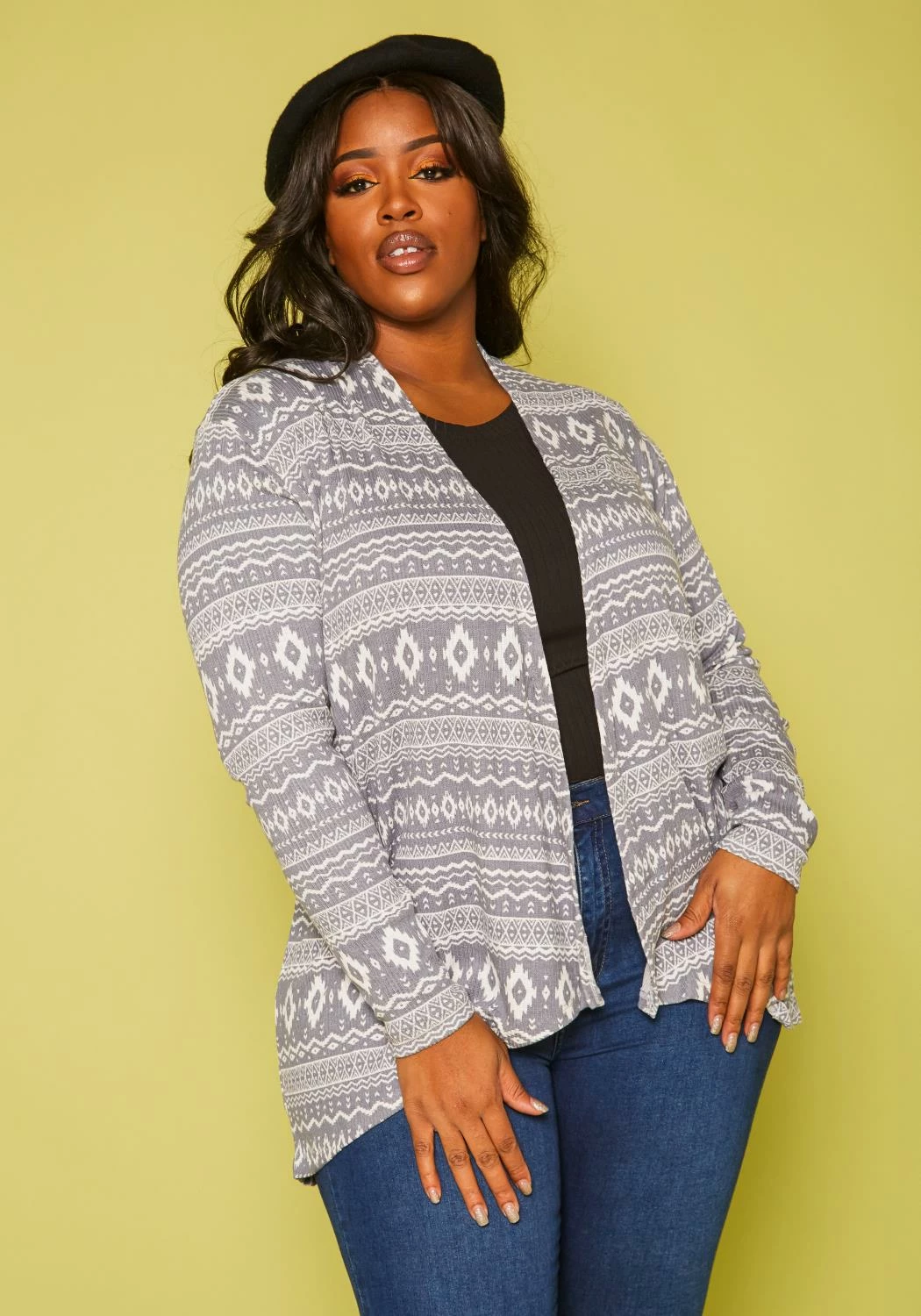 Casual plus size women’s cardigan in aztec pattern, open front style, fitted long sleeves and knit material.