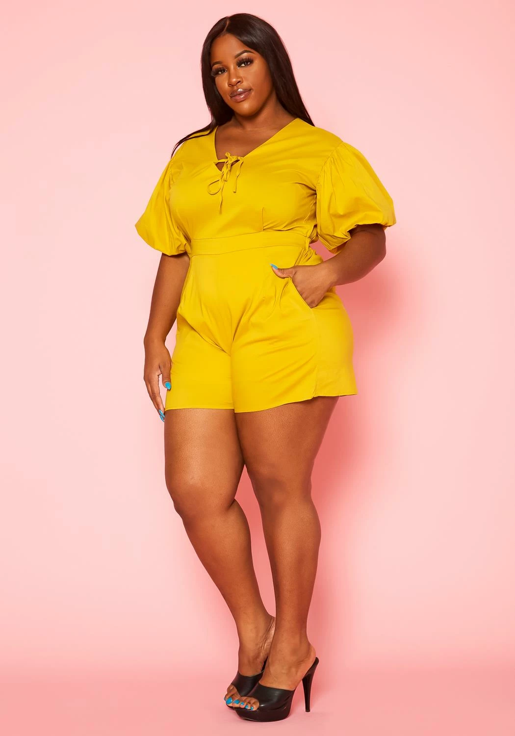Plus size women’s romper, featuring a v-neck front with tie-up closure detail, short ballon sleeves, elastic waist band, pockets & back button closure.