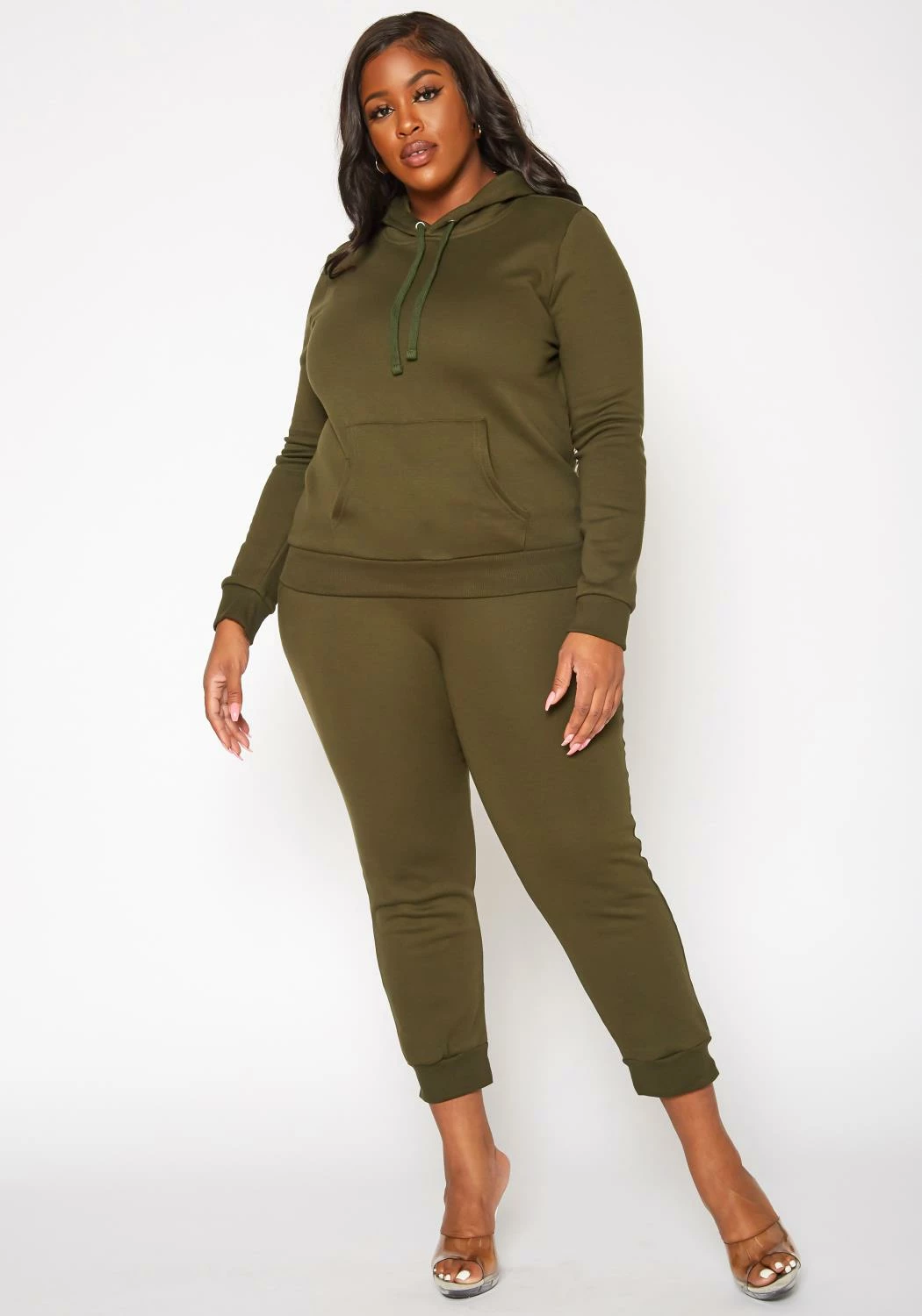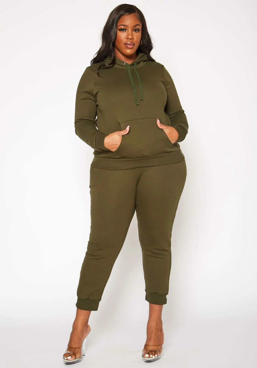 Plus size women’s basic jogger pants with waistline drawstring hem, ankle cuffs and pocket hem.