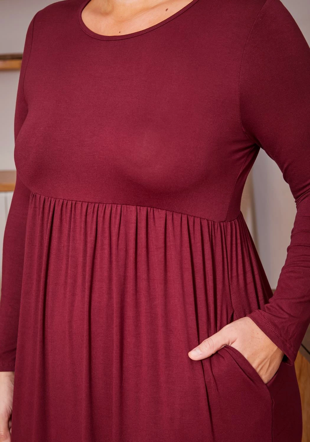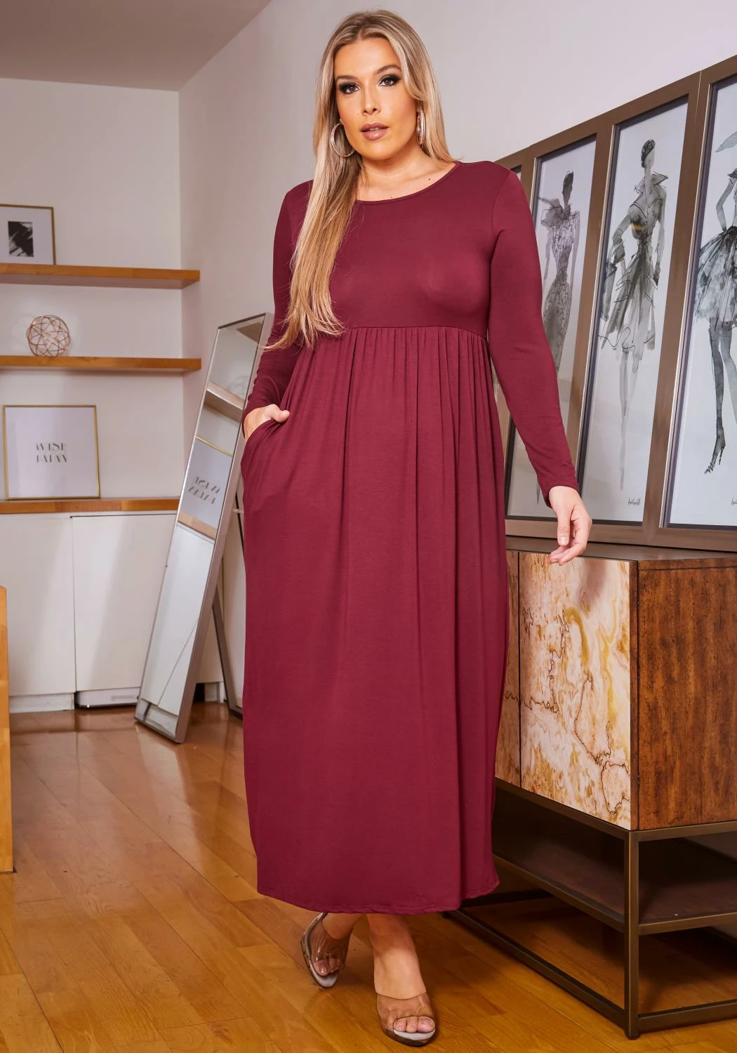 Plus size women’s casual maxi dress in fit to flare design, solid color, fitted long sleeves and round neck style.