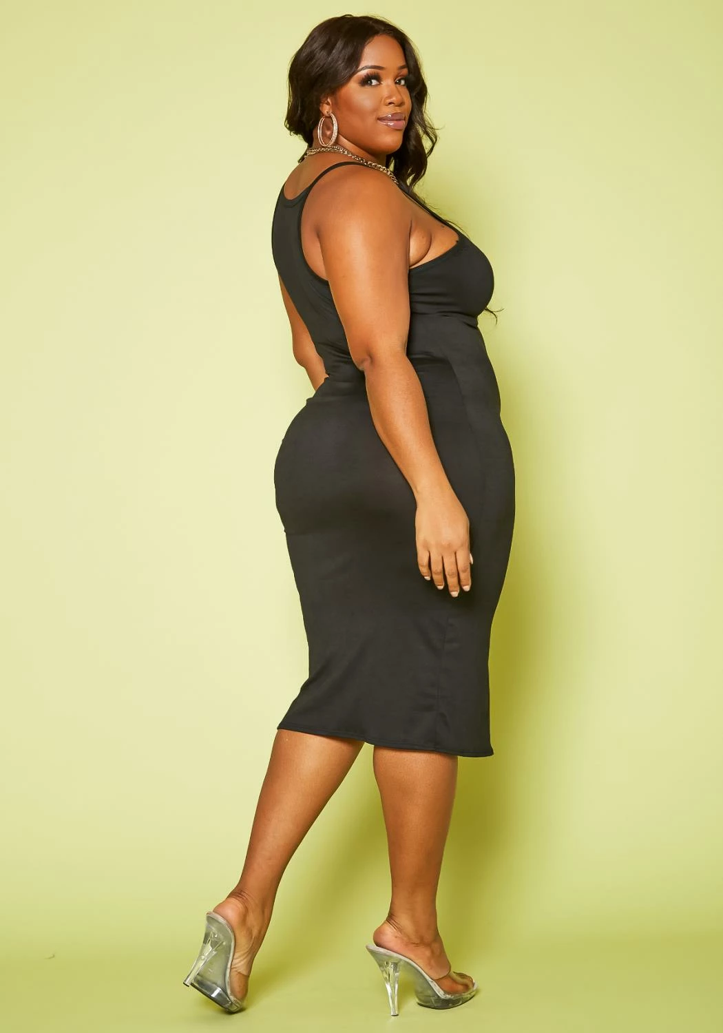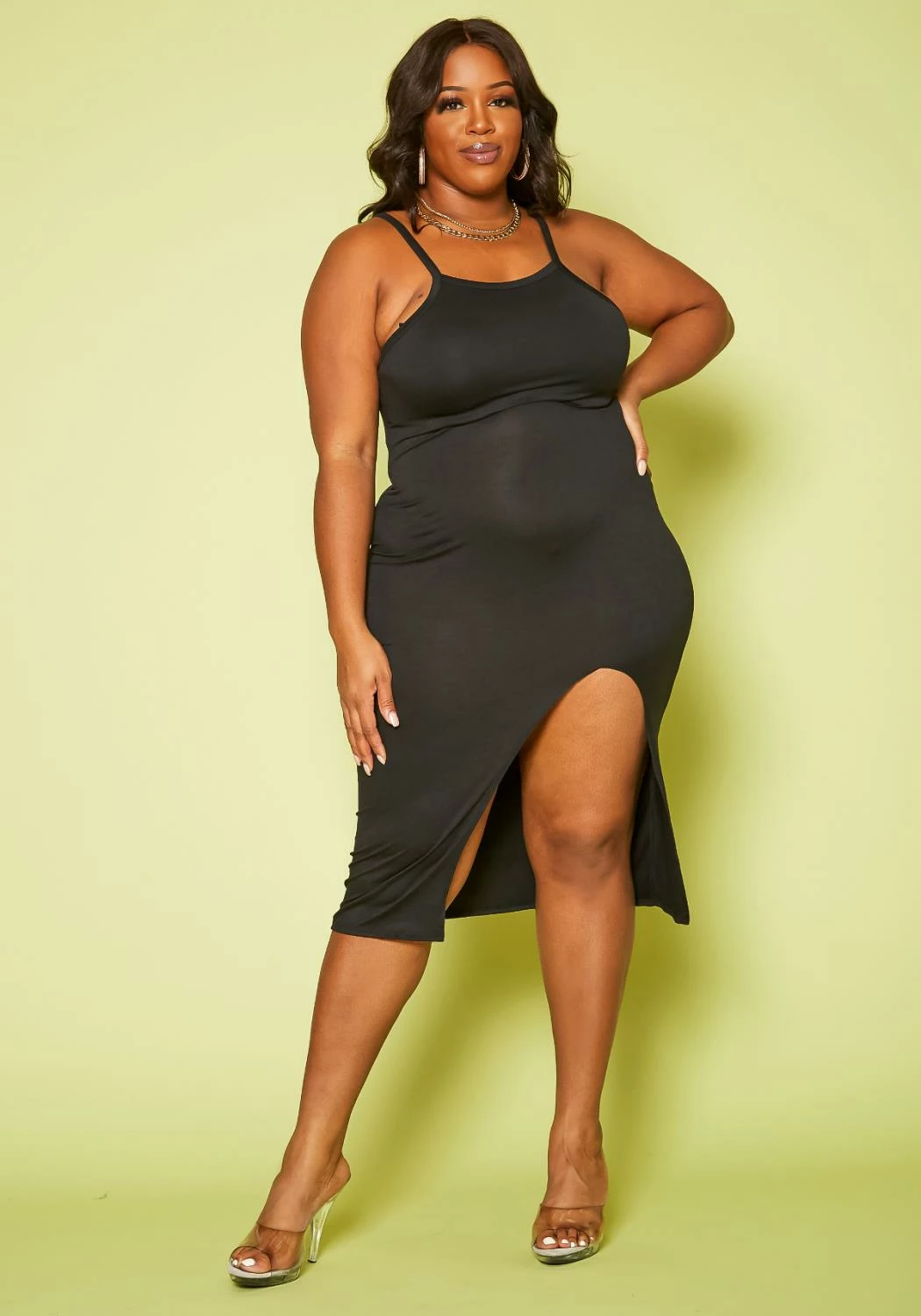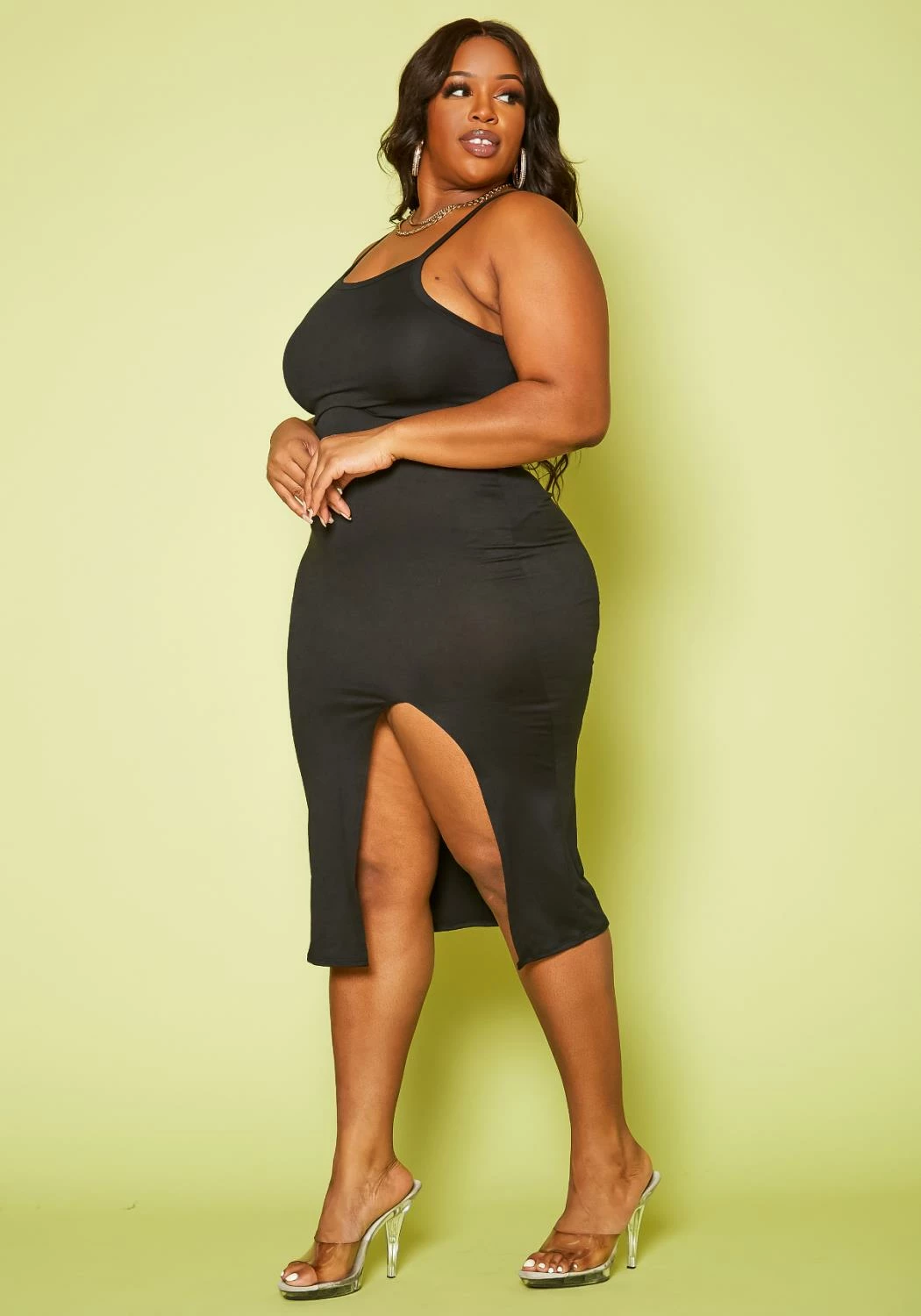 Trendy basic plus size women’s cami dress in scoop neck front, slit hem detail and racerback style.
