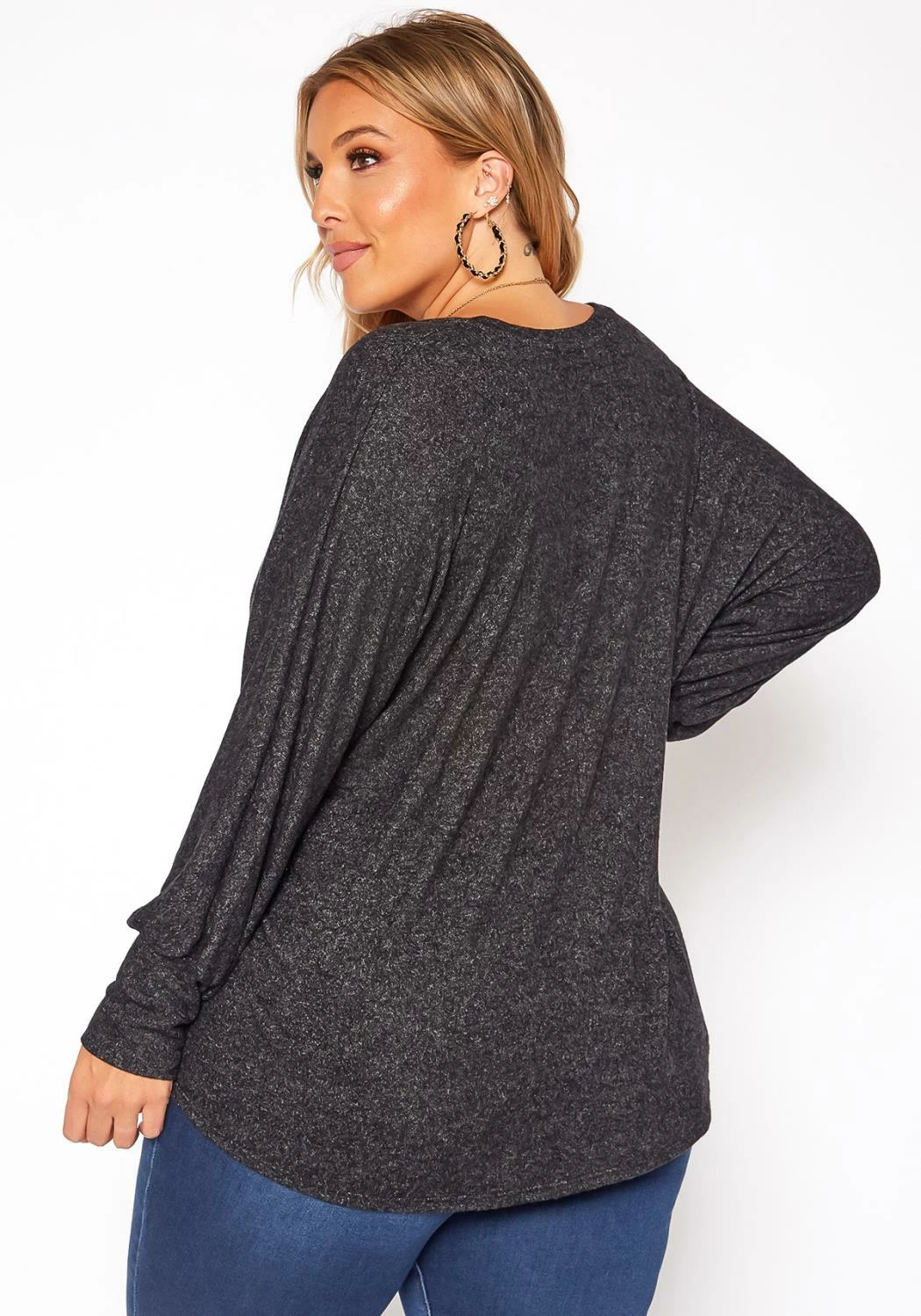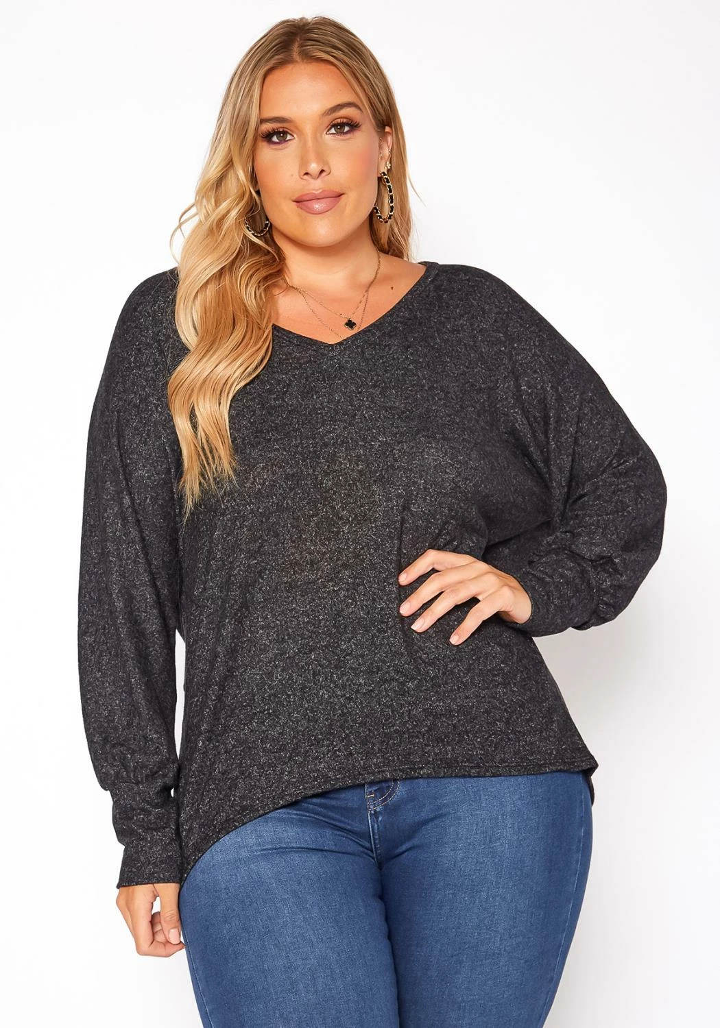 Casual plus size women’s knit sweater in v-neck style and drop shoulder long sleeves with fitted wrist cuffs.