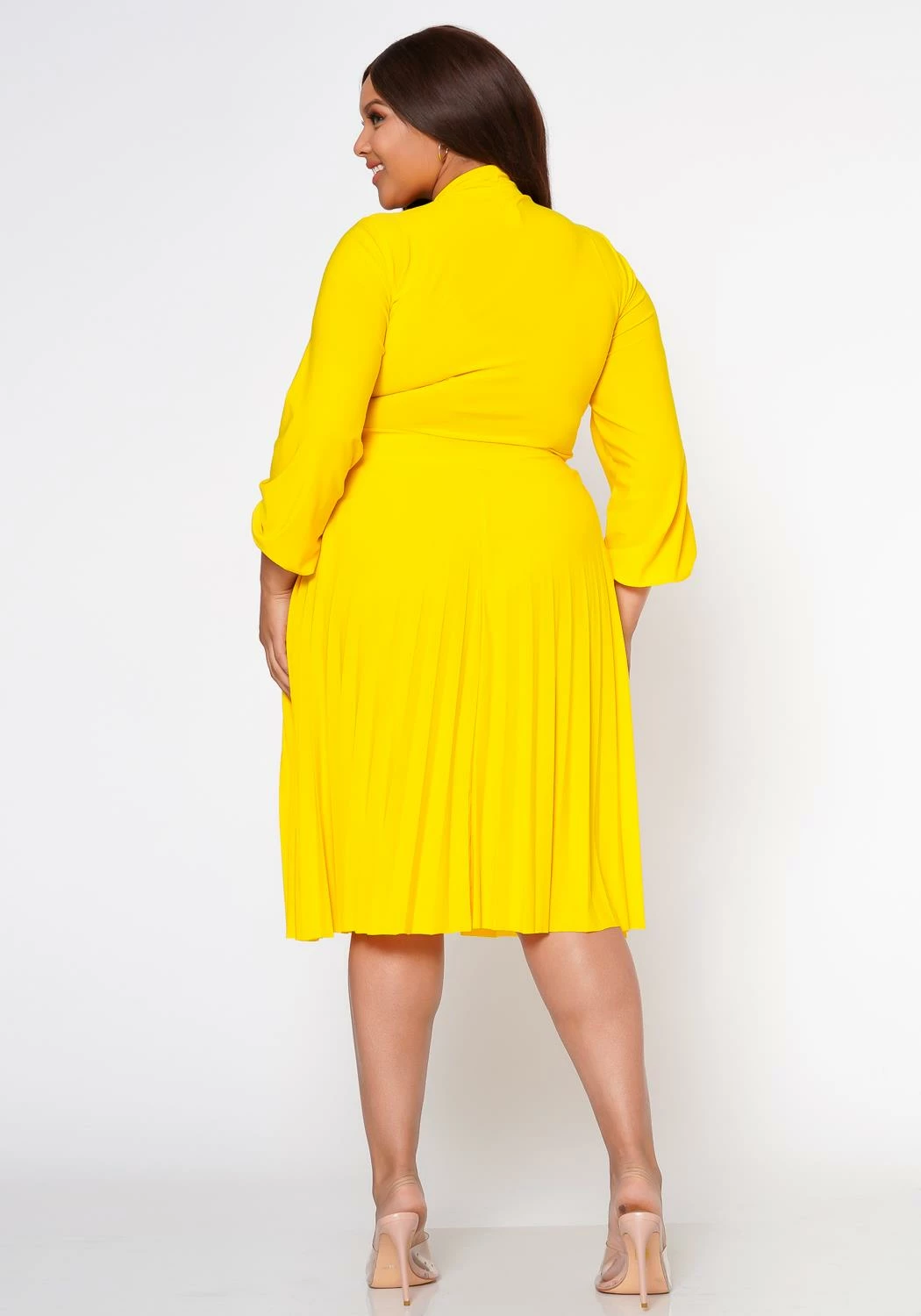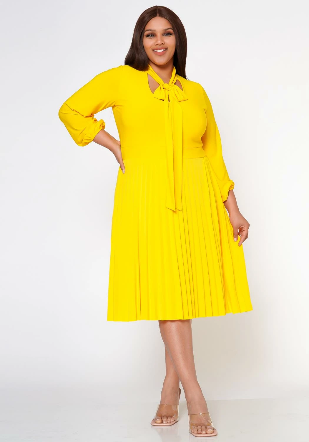 Classy plus size women’s fit & flare dress with pleated design, long sleeves, fitted wrist cuffs, bow collar ascent and v-neck cut out.