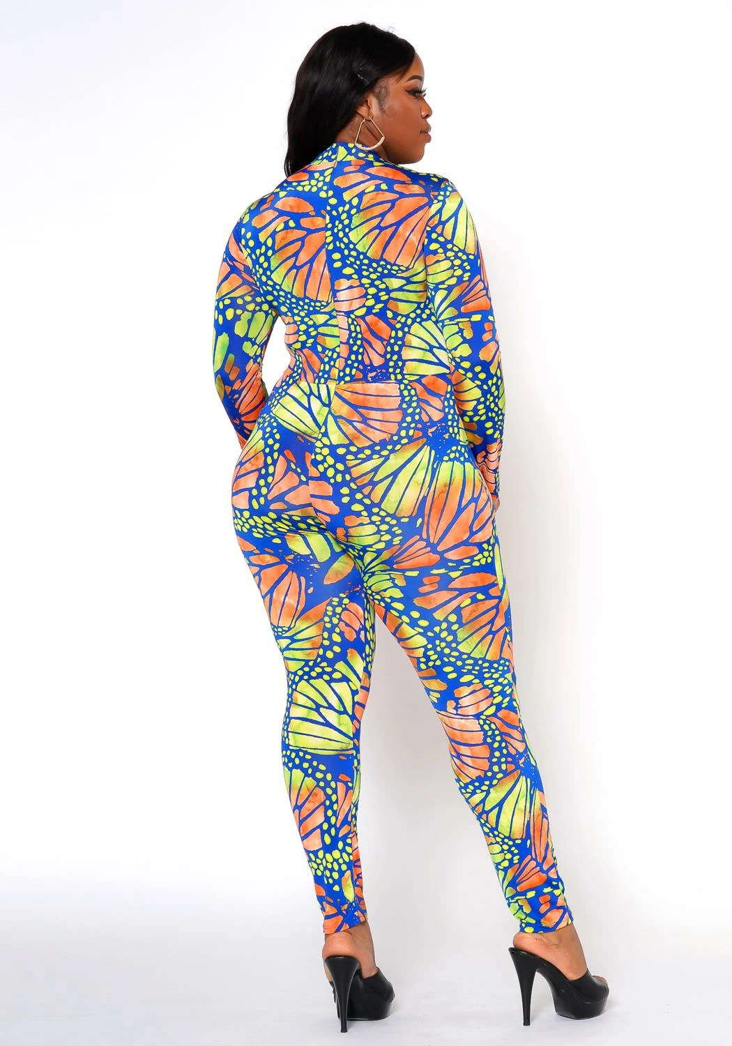 Outstanding plus size women’s fitted jumpsuit in butterfly print, mock neck and long sleeves.