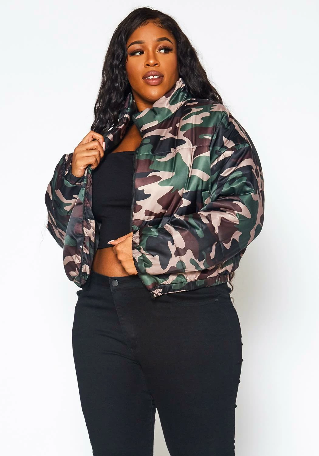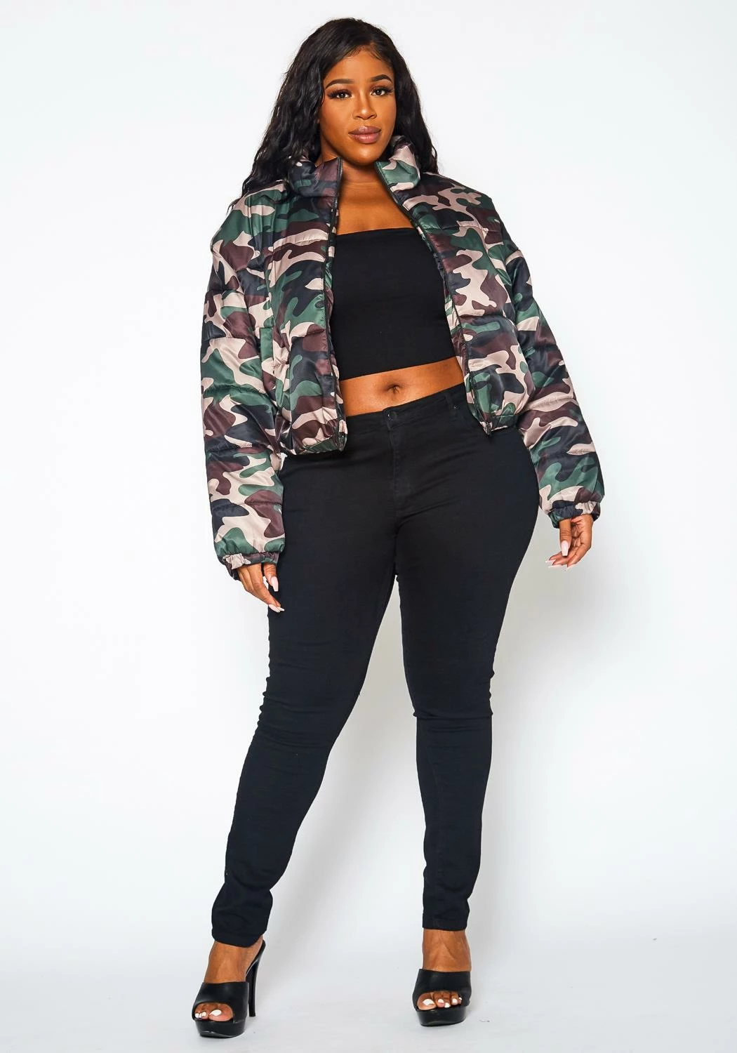 Trendy plus size women’s puffer jacket in high neck style, front zipper closure, cropped fit and side pocket ascent.