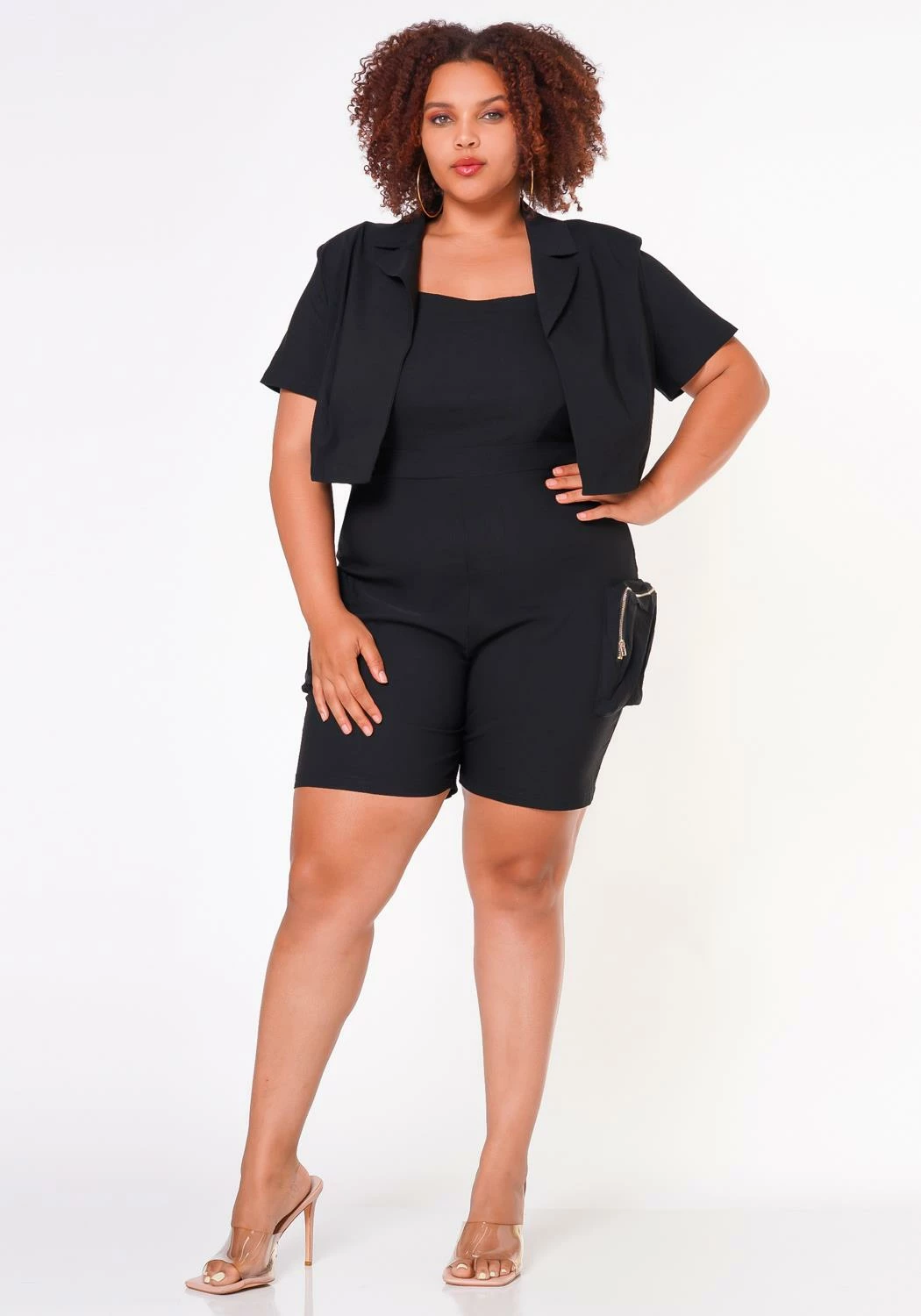 Classy tube cargo romper with cropped short sleeve jacket for plus size woman featuring zipper bottom pockets and back zip up accent.